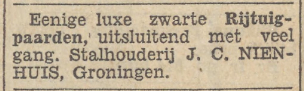 Casper Nienhuis (1857-1922) draagt de stalhouderij in 1904 over aan zijn oudste zoon Jacobus Casper (1879-1957). De aanleiding daarvoor is tamelijk cru. “Bij den stalhouder Nienhuis te Groningen heeft het personeel, zeven koetsiers en de stalbaas, gistermorgen het werk neergelegd. Een koetsier, die den vorigen avond tot elf uur gereden had, was gistermorgen 20 minuten te laat gekomen en was daarvoor voor een dag naar huis gezonden. Het personeel wilde, dat de patroon deze straf introk en toen deze weigerde, ging het ook heen. De stakers hebben nu voorwaarden gesteld, waarop zij weer aan het werk willen gaan. “Naar de Pr. Gr. Ct. verneemt, is de heer Nienhuis van plan zijn stalhouderij op te heffen”, staat op 27 september 1904 in de landelijke ochtendkranten.