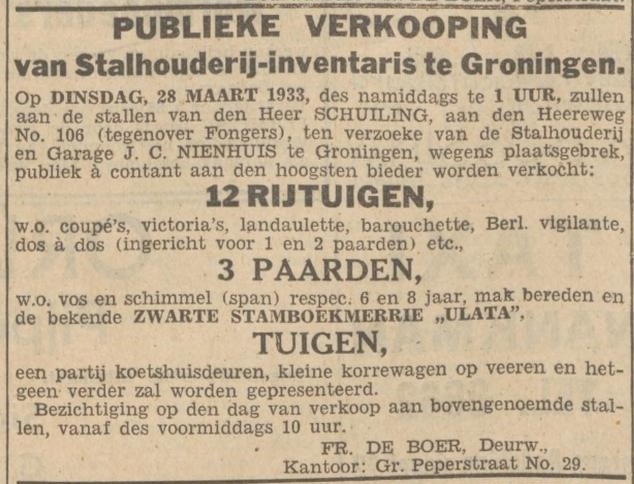 Toch kan al dat plezier niet wegnemen dat drie jaar later een deel van de stalhouderij ‘wegens plaatsgebrek’ onder de hamer gaat. Twaalf rijtuigen, waaronder coupés, victoria’s, landaulette, barouchette, vigilante en dos-à-dos, deels de rijtuigen die Nienhuis al in eerdere jaren tevergeefs probeerde te verkopen. Van de paarden gaan een schimmel, een vos en de zwarte stamboekmerrie Ulata weg, plus een ‘partij koetshuisdeuren’. Die laatste zijn mogelijk blijven liggen na de verbouwing van de stalhouderij tot garage. De verkoping is aan de stallen van de heer Schuiling, paardenhandelaar aan de Hereweg 106, tegenover rijwielenfabriek Fongers.