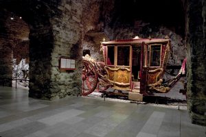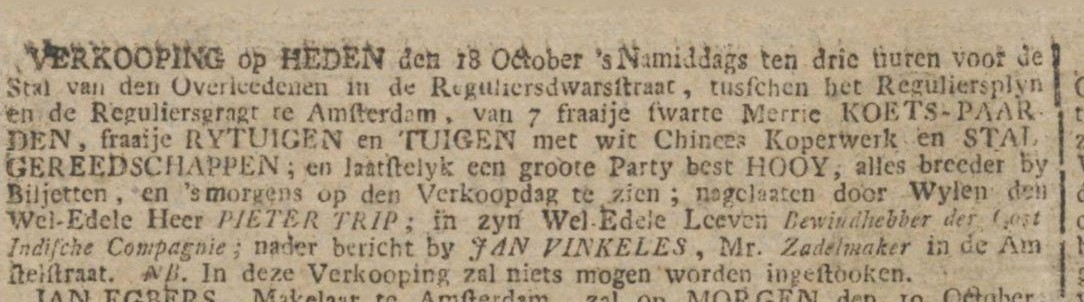 Blader ‘ns door oude kranten als de Opregte Haarlemsche of de Amsterdamse Courant in de 18e eeuw en zie wat er te koop stond op de Amsterdamse grachten. Zeven (!) zwarte paarden, rijtuigen en tuigen met ‘wit Chinees koperwerk’ van Pieter Trip, bij leven bewindhebber van de VOC. Te koop op 18 oktober 1786 aan de stallen van de overledene aan de Reguliersdwarsstraat. Zo’n stal was niet opgebouwd uit soberheid. En nog eerder in het jaar 1700, toen zette de Raad van Staten der Vereenigde Nederlanden een advertentie om op 8 februari voor de St. Joris Doelen in ’s Gravenhage te verkopen: “een zeer kostelijcke Karos voor 4 Persoonen, die noyt gebruyckt is, swaer vergult en seer fijn gebeeltwerkt en geschildert, met sierlijck Koperwerck en hangende op Kopere Veeren, van binnen met root Carmosijn Fluweel, rijckelijck gegarneert met een Falbolade van Gout Galon en Gout Borduursel, Goude Snoeren en Spiegel Glasen.”