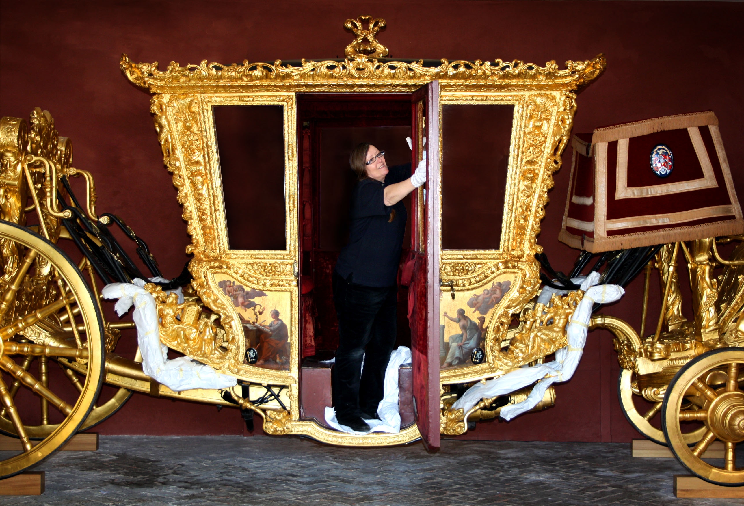Conservator Sofia Nestor: “In de 18e eeuw is de karos aangepast en vergroot door zijn nieuwe eigenaren, en er is een extra deurpaneel aan toegevoegd. In 1971 zijn röntgenfoto’s gemaakt van de beschildering op het originele rechter deurpaneel en daarbij was te zien dat de koninklijke kroon is geschilderd over een grafelijke kroon, ondersteund door griffioenen. Dat is geïdentificeerd als het wapen van de Franse graaf Jean Baptiste Fleuriau de Morville (1686-1732), ambassadeur in Nederland van 1718-1720.”