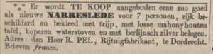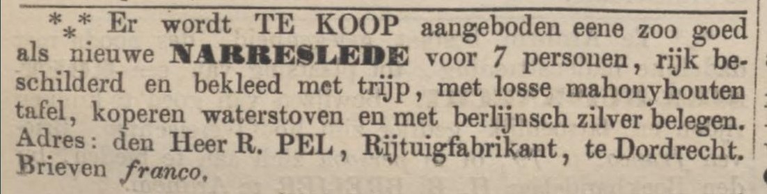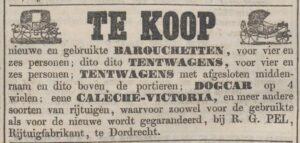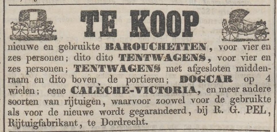 Richardus Gerardus (Rijk) Pel (1818-1891) is rijtuigmaker en zoon van een rijtuigmaker uit Zeist. Hij huwt in 1845 met de 22-jarige Christina Maria Elckenbout uit Dordrecht en werkt vanaf die tijd in haar geboortestad aan drowsky’s, barouches, tentwagens en tilbury’s. De werkplaatsen van Pel zijn ingericht om een compleet rijtuig te maken, met een houtwerkplaats, de basis van de wagenmakerij, en een eigen smederij, waarin werk is voor twee smidsknechten. Pel zit aan het Stek, een pleintje in het hart van de stad, waar de stallingen zijn te vinden van de kloveniersdoelen (gesloopt in 1857) en waar circussen neerstrijken om ‘menschen uit Java’, pelikanen en luipaarden aan het hooggeëerde publiek te laten zien. Aan het Stek zijn ook stallen van equipagebezitters en is de Dordrechtsche Manege gevestigd.