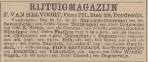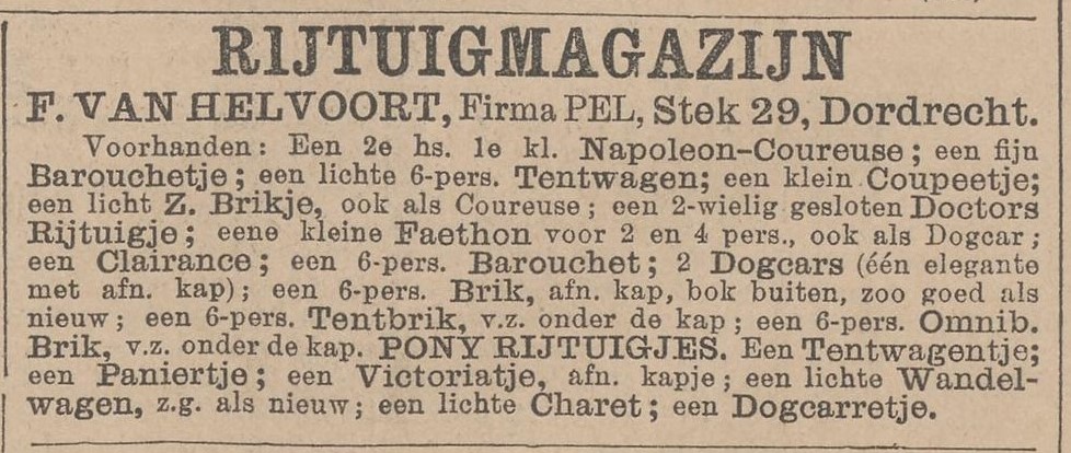 In 1892, wanneer Rijk Pelt overlijdt, verhuizen Frans en zijn gezin naar Dordrecht om daar de firma verder te zetten onder de naam ‘firma Pel, rijtuigfabrikant te Dordrecht’ aan het Stek. Hij gaat dus verder onder de naam van zijn schoonvader en ondertekent zelfs brieven met ‘R.G. Pel’. Frans heeft onder andere te koop een ‘klein duwcoupéetje op 3 wielen, geschikt voor gebrekkige of ziekelijke jongeheeren of jongejuffrouwen’, lichte break-omnibussen met afneembare kap, phaetons met verplaatsbare kap, coureuses en dogcars, en adverteert vooral in Brabantse kranten, zijn eigen achterland, dat in tegenstelling tot zijn schoonvader die zijn klandizie vooral in Zeeland zocht. Een mooi voorbeeld uit het aanbod: “Te koop een eerste kl. 2 hs. Napoleon Coureuse. Elegant rijtuig, afneembare vachet, verlakt lederen kap, blauw chagrin leder bekl. met damesruggen matrassen” (Nws vd Dag, 8-7-1896). Als rijtuigmagazijn van Dordrecht is het bepaald geen eenmanszak getuige de oproep in 1895 voor in één keer vier knechten. Opvolgers zijn er echter niet, met een zoon als operazanger en de ander ziekelijk en daarom eervol ontslagen als ambtenaar in Nederlands Indië.