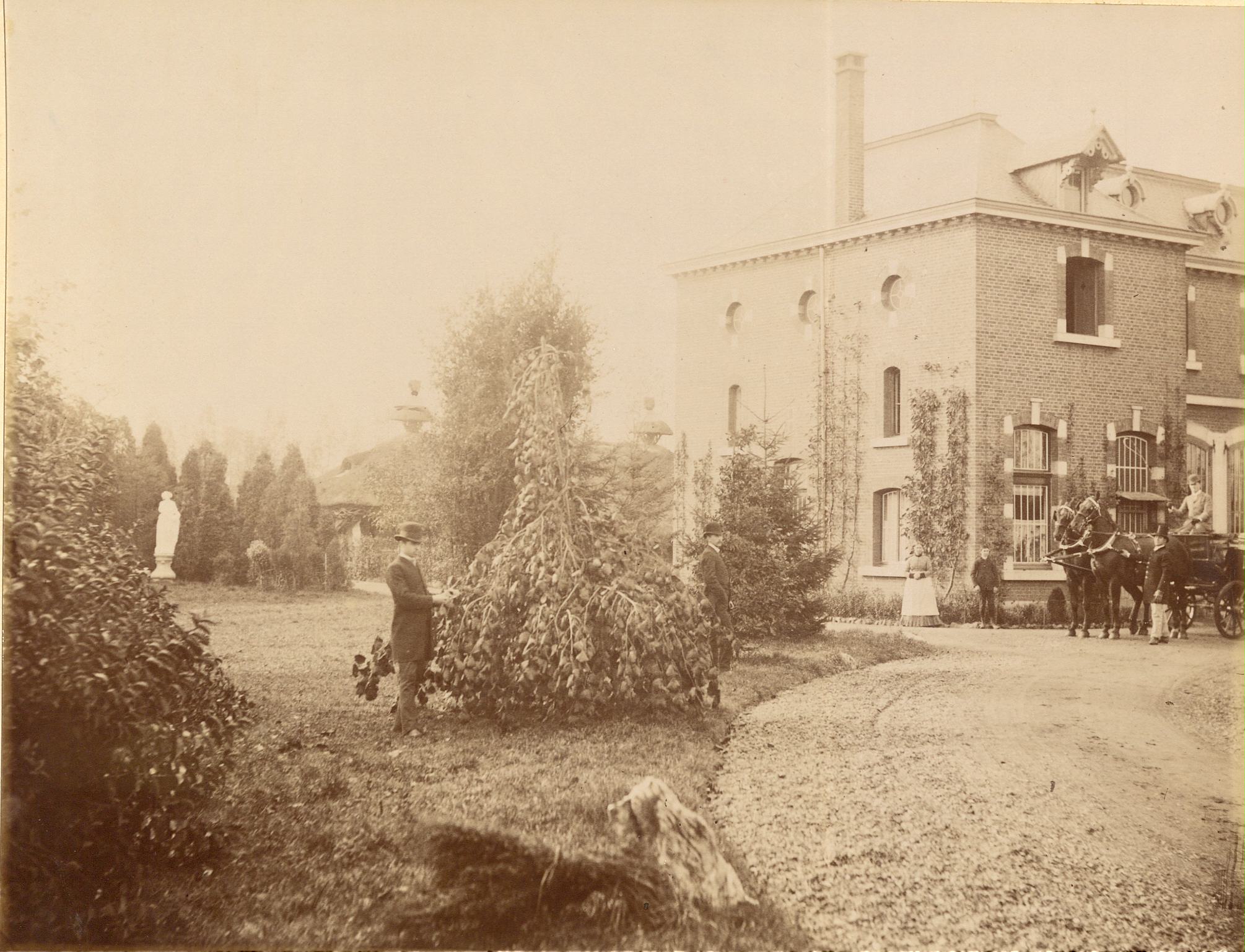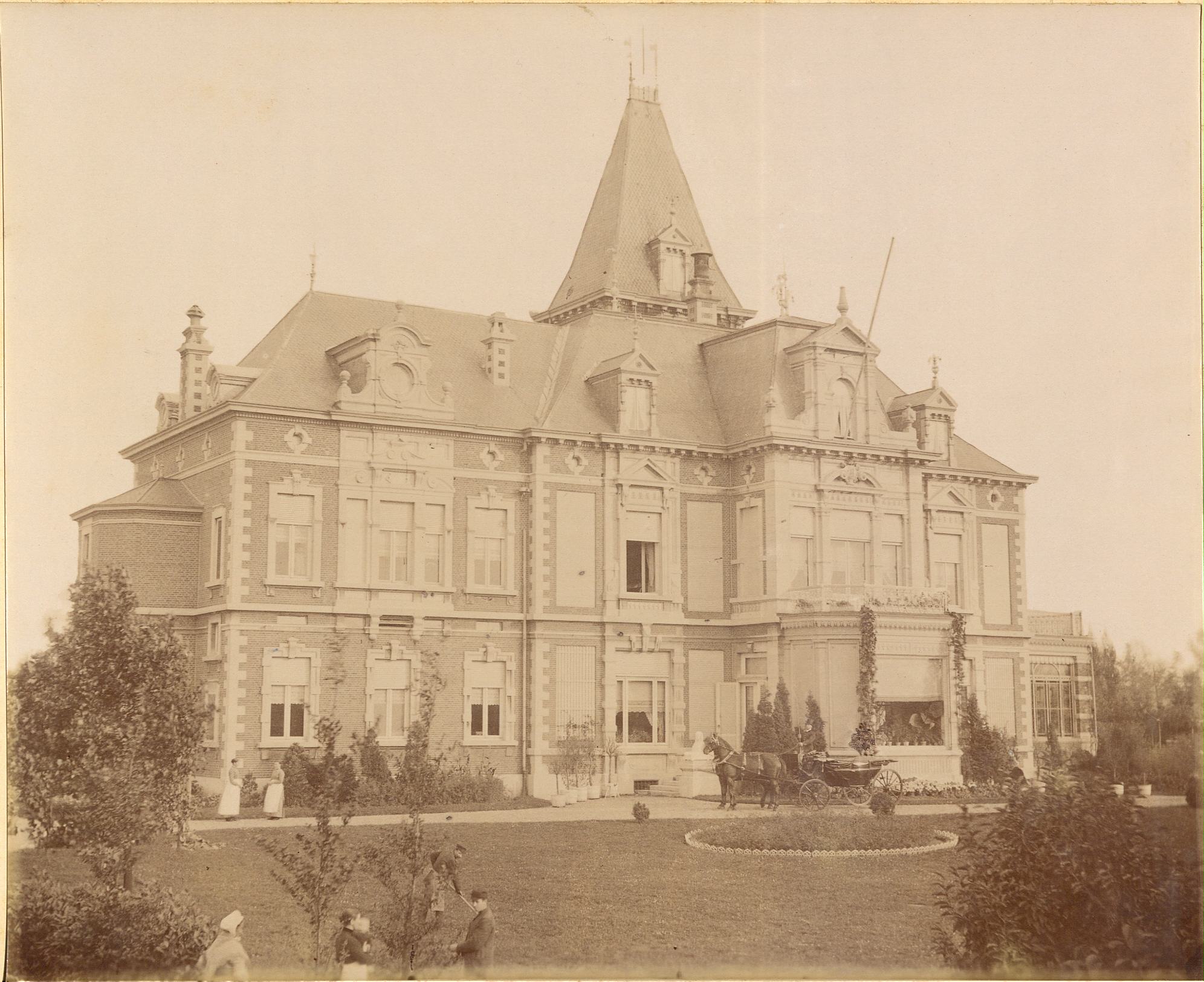Op de bok Max Regout (1864-1906) en een koetsier, achter in de wagonette zitten echtgenote Anna Rutten (1865-1917) en hun drie kinderen. Max is een zoon van Edouard Regout en zij een dochter uit een bierbrouwersfamilie.