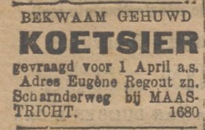Met name Eugène – getrouwd met een dochter van ‘postvervoerder’ Bonhomme – was structureel op zoek naar een betrouwbare koetsier, en zette van 1877 tot in 1904 bijna jaarlijks een oproep in de krant. Sterker nog, in 1903 zet een koetsier ‘thans in dienst op Wyckerveld’ een advertentie op zoek naar een nieuwe betrekking. Hij wilde of moest er weg. Mogelijk was het een kostenkwestie en gaf deze Regout niet te veel geld uit aan huispersoneel. Ter vergelijking: toen Eugène een keukenmeid op de Groote Staat in Maastricht zocht, bood hij een salaris van honderd gulden, de helft van wat een dienster op een buitenplaats elders in Nederland verdiende. Normaalgesproken was koetsier een baan voor lange tijd. Eugène zocht een bekwaam koetsier, gehuwd en liefst zonder kinderen. Vanaf 1907 vervulde de besnorde Toussaint Gilissen (1857-1945), beter bekend als Tossing, die rol. Tossing verpacht zijn eigen boerderij in Keer en verhuist met zijn gezin naar het Wyckerveld, om een boerderij te pachten van Eugène Regout. Waarom Tossing het dorpje Keer verliet om drie jaar elders te gaan wonen is niet bekend. Was zijn eigen boerderij in een te slechte staat? Het zal geen weelde zijn geweest; de oudste kinderen liepen dagelijks naar Maastricht om melk te venten. Tossing kon het goed kon vinden met zijn pachtheer op de villa Wyckerveld, en reed hem rond om de landerijen in de buurt te bezichtigen. Ook als Regout naar de stad moest fungeerde Tossing als koetsier. Maar wanneer in 1908 Eugène Regout overlijdt, willen diens kinderen de erfenis verzilveren en in november 1910 keert het gezin van Tossing terug naar Keer.