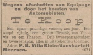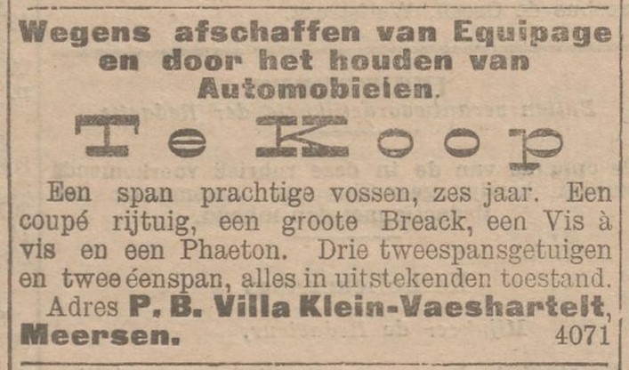 Op villa Klein-Vaeshartelt, een ander huis van de familie, stond een vergelijkbare boedel te koop in de Limburger Koerier van 11 april 1904 vanwege de aanschaf van automobielen (let op het meervoud): twee zesjarige vossen, een grote break, een vis-à-vis, een phaeton en drie spantuigen.