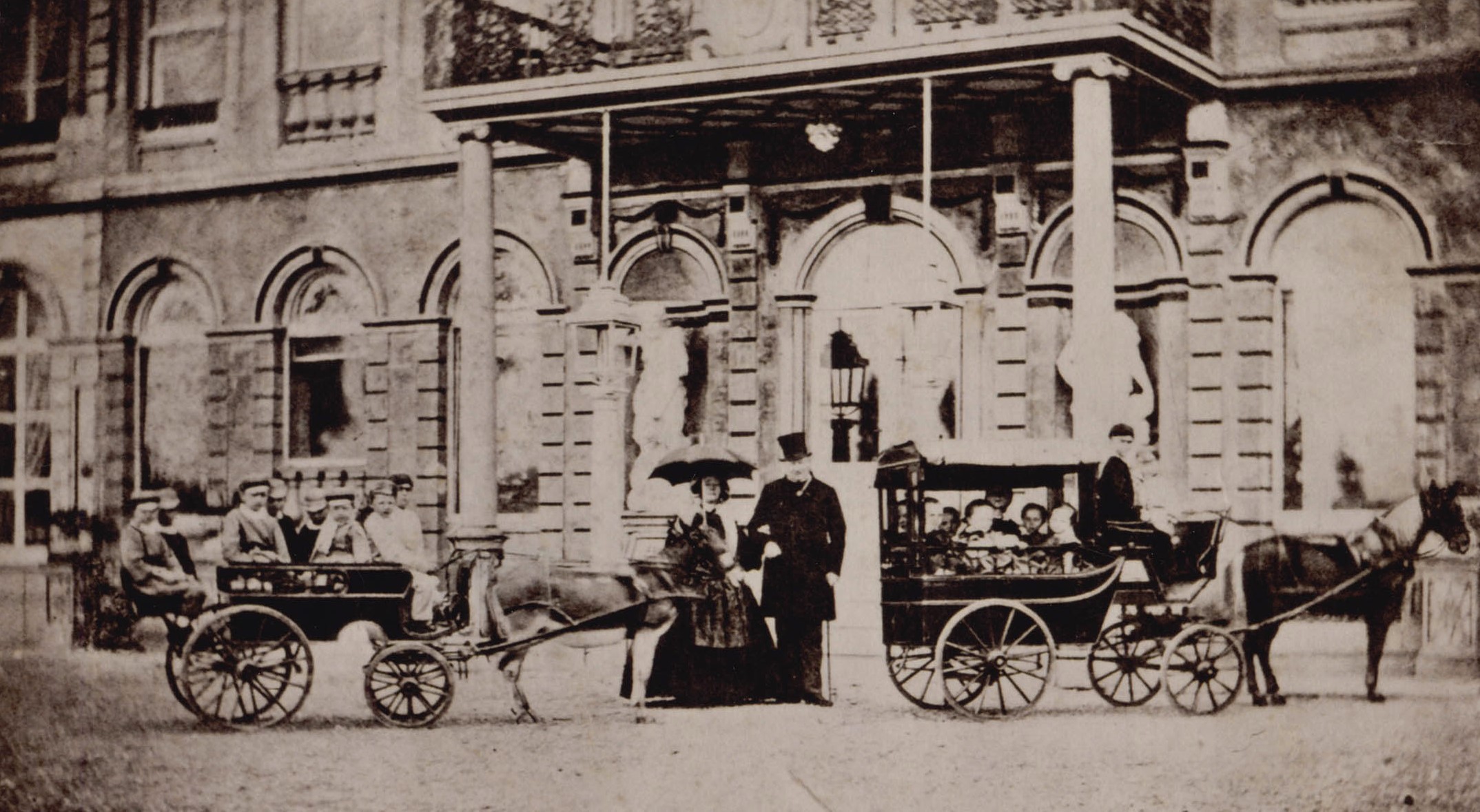 Op de bok naast de koetsier zit Eugène Regout, industrieel, terwijl zijn kinderen zich