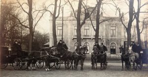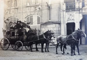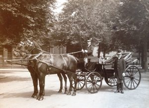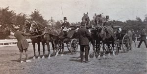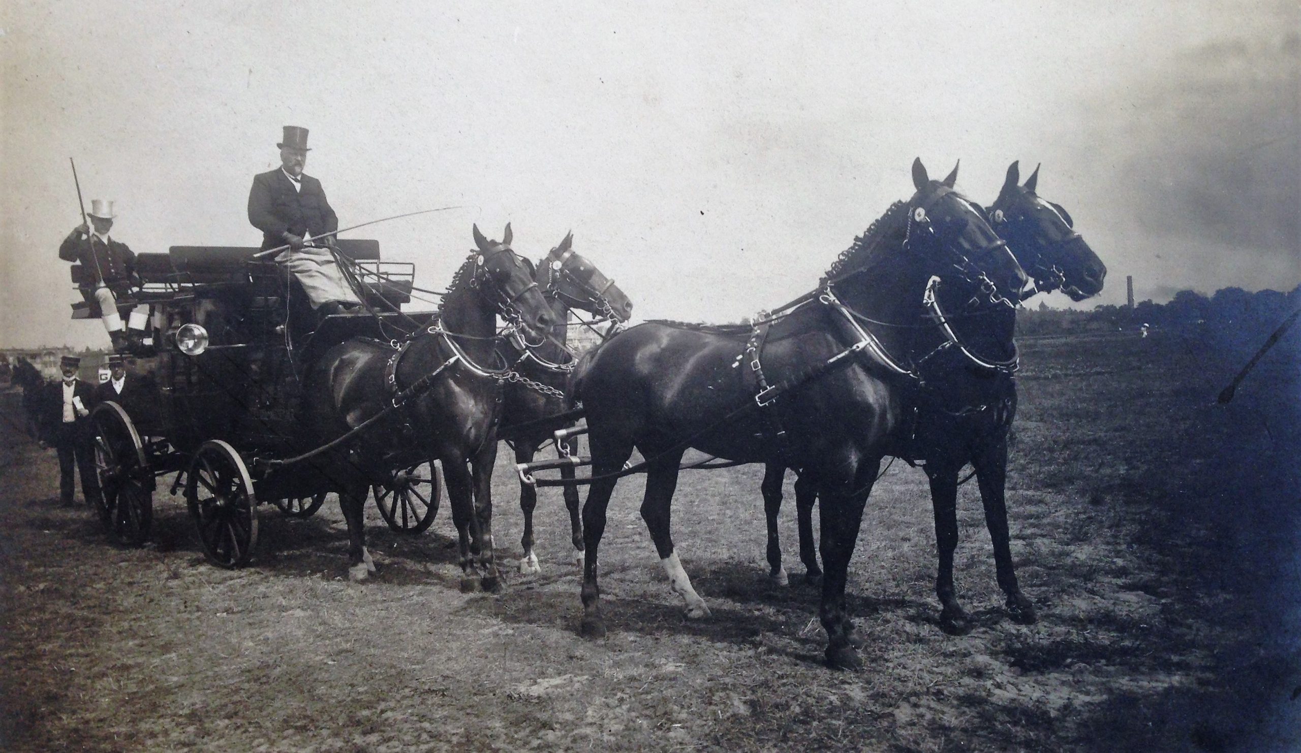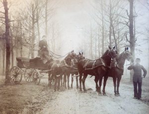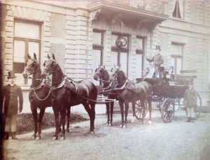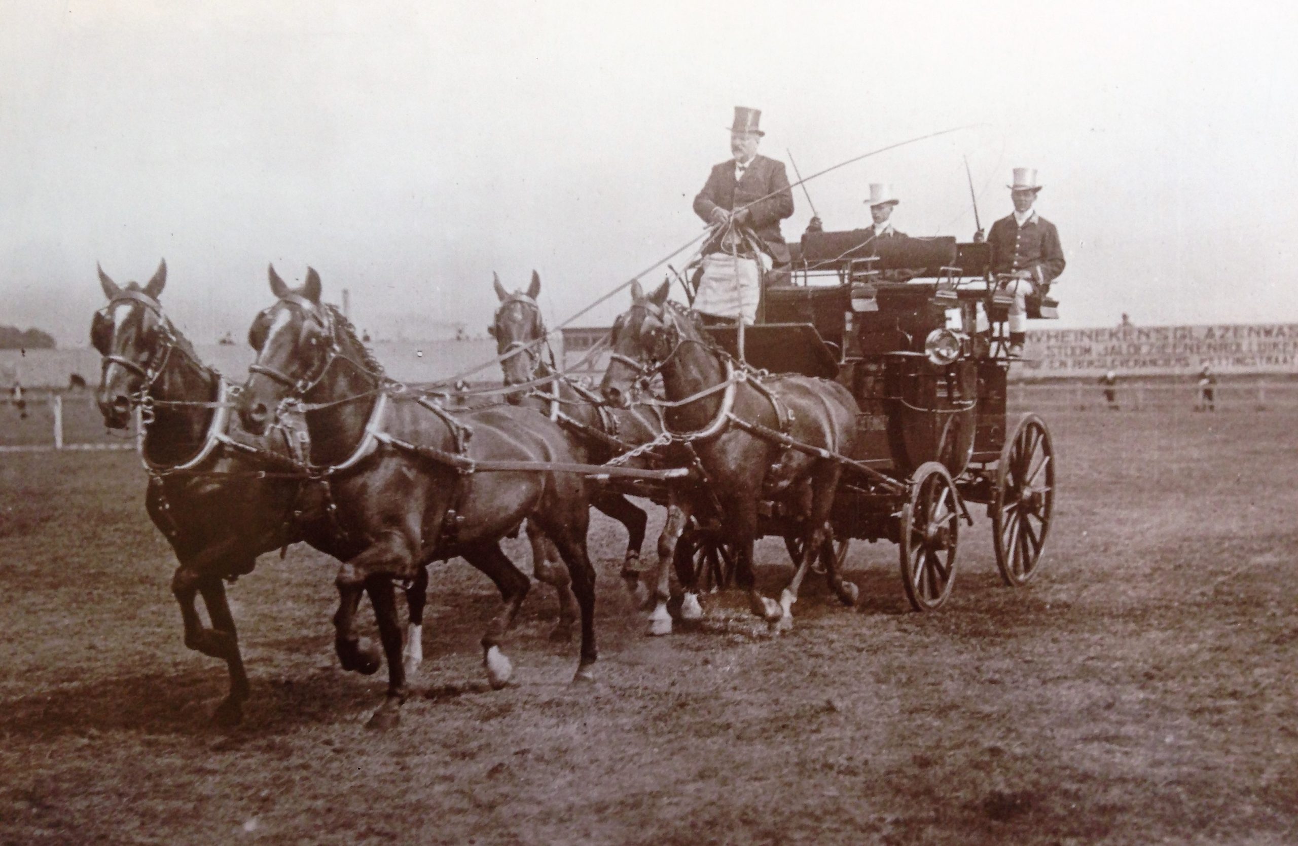 foto boven: Peter Willem Riemer met het winnende zesspan in 1903. “Vader reed er prachtige 8-figuren mee. ‘Beste rijder van Europa’, zei men. Let op de afmetingen van de lantaarns dezer brik. Paarden waren Nederlandse lichtbruinen.”