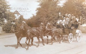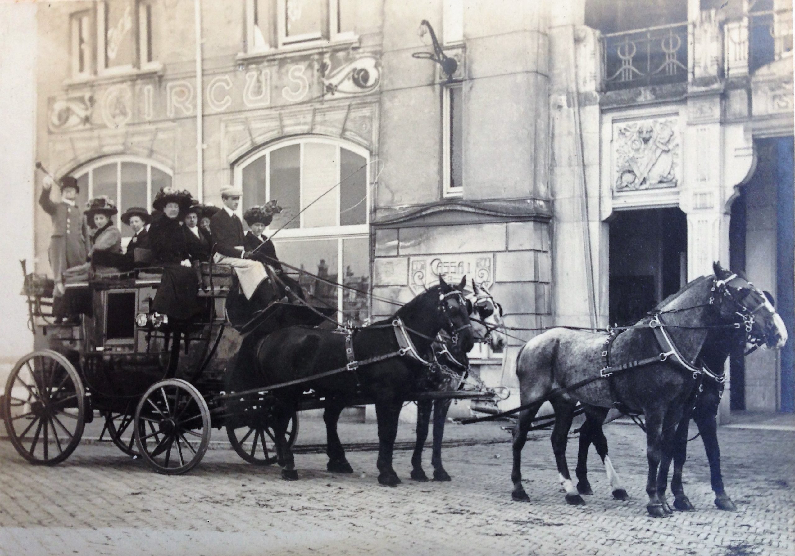 Geerlig Riemer (3de generatie) met één van zijn twee coaches voor het Scheveningse Circus. Hij schreef er bij: “Vanwege de harde wind bleef de grijze hoge hoed thuis. Tweede van links Willy, dan mejuffrouw Langelaar en Mies, vaders latere tweede echtgenote.”