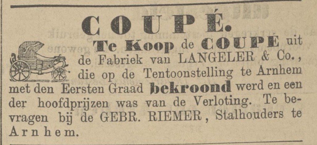 In 1879 kopen de Riemers voor de wederverkoop deze prijswinnende, maar on-geschilderde en ongestoffeerde coupé van rijtuigmaker Jan Willem Langeler uit de Spijkerstraat.