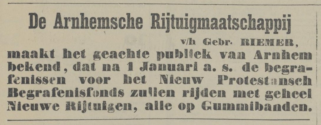De stalhouderij blijft statutair onveranderd tot de vijf broers met twee ton aan kapitaal in 1901 een nieuw commercieel ‘vehikel’ optuigen: de Arnhemsche Rijtuigmaatschappij, vh Gebroeders Riemer.