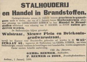 Een ander nieuwtje dat de aandacht krijgt in de Arnhemsche Courant van 26 maart 1878: “Jan Michiels herdacht zaterdag jl. dat hij 25 jaren als stalhoudersknecht bij dezelfde firma in dienst was. Eerst bij wijlen den heer Meulenbroek en thans bij de gebroeders Riemer. Van zijne patroons ontving de jubilaris op dien dag een prachtig zilver remontoir horologie met toepasselijke inscriptie , terwijl zijne kameraden hem mede een aandenken schonken.”