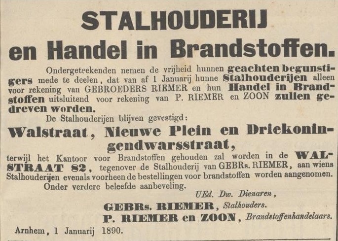 In het hippische tijdschrift Nederlandsche Sport van 26 april 1902: “Dezer dagen brachten wij, te Arnhem zijnde, aldaar een bezoek aan de stallen van de heeren Gebr. Riemer, en hadden volstrekt geen spijt over dat plotseling in ons opgekomen idéé. Met de meeste welwillendheid stelde een der heeren Riemer ons in de gelegenheid de schoone collectie paarden, die daar in een goeden, ruimen, luchtigen, naar de eischen des tijds ingerichten stal, vereenigd waren, te zien. Wij zagen daar verscheidene mooie rijtuigpaarden, alsmede eenige rijpaarden, en kwamen tot de overtuiging dat zij die, gedurende de zomermaanden in den omtrek van Arnhem vertoevende, een span luxepaarden voor dien tijd bij de Gebr. Riemer huren, een chique kunnen slaan, alsof zij met eigen équipage rijden. Liefhebbers van mooie paarden kunnen wij bepaald aanraden, om, bij een verblijf te Arnhem, de stallen van de heeren Gebr. Riemer een bezoek te gaan brengen.”