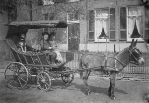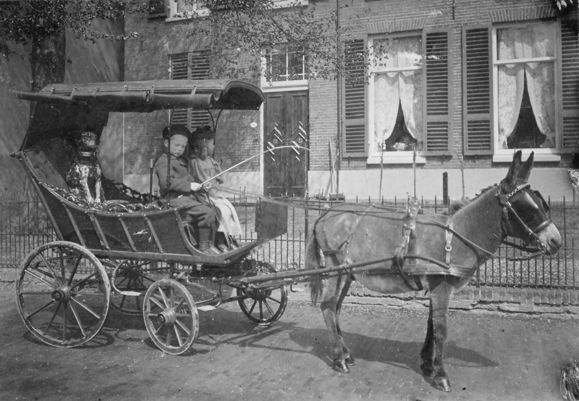 Aandoenlijke foto uit 1896. Geerlig, zijn zusje Willy en hond Hector in de tentwagen voor het ouderlijk huis aan het Nieuwe Plein 47 (in 1914 afgebroken voor de bouw van Luxor theater), met ernaast de stalhouderij op de hoek met de Oude Stationsstraat.