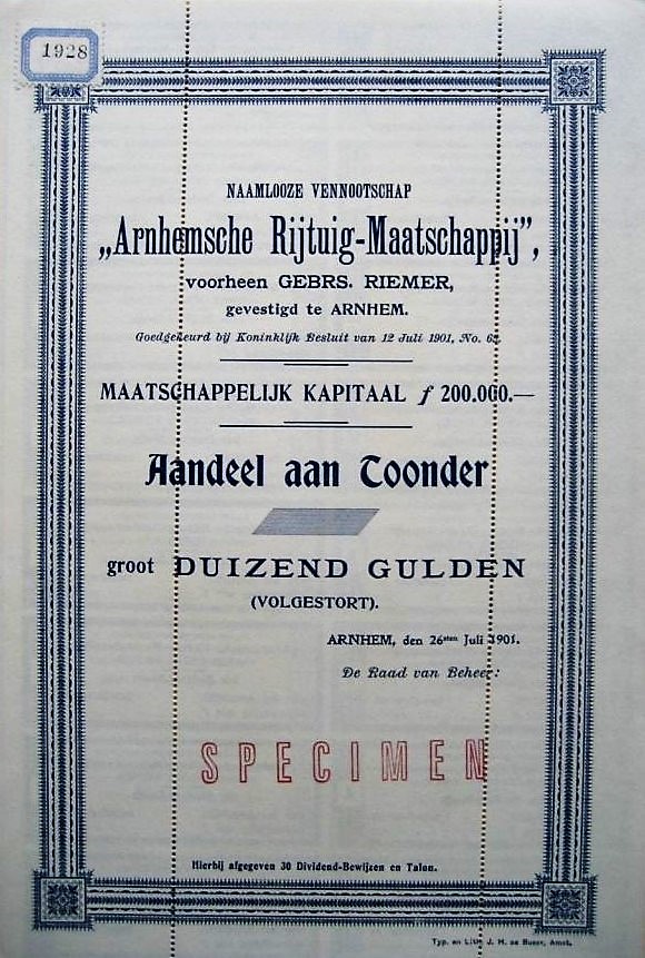 De stalhouderij blijft statutair onveranderd tot de vijf broers met twee ton aan kapitaal in 1901 een nieuw commercieel ‘vehikel’ optuigen: de Arnhemsche Rijtuigmaatschappij, vh Gebroeders Riemer. Die laatste naam blijft evenwel in de wandelgangen bestaan voor de handel en het uitbrengen van de paarden op concoursen.