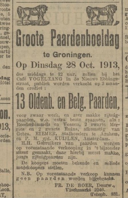 Het zal nog even duren eer de laatste paarden van Riemer er uit gaan, dat gebeurt op dinsdag 8 april 1919, wegens opheffing der stalhouderij. Bij het koetshuis en in de stallen aan de Walstraat komen dan dertig paarden onder de veilinghamer: “goed bij den weg loopende vertrouwde paarden, van verschillenden leeftijd en kleur, waarbij goede fokmerries, ongeveer 60 goedonderhouden rijtuigen, waarbij coupés, vigilantes, Berliners, Landauers, Victoria’s, brikken en grote rijtuigen, w.o. een zoo goed als nieuwe 18-persoons tentwagen en een dichte meubelwagen; de meeste rijtuigen zijn op gummibanden. Voorts verschillende twee- en eenpaards-borst- en gareeltuigen, disselriemen, stroppen, stangen enz.”