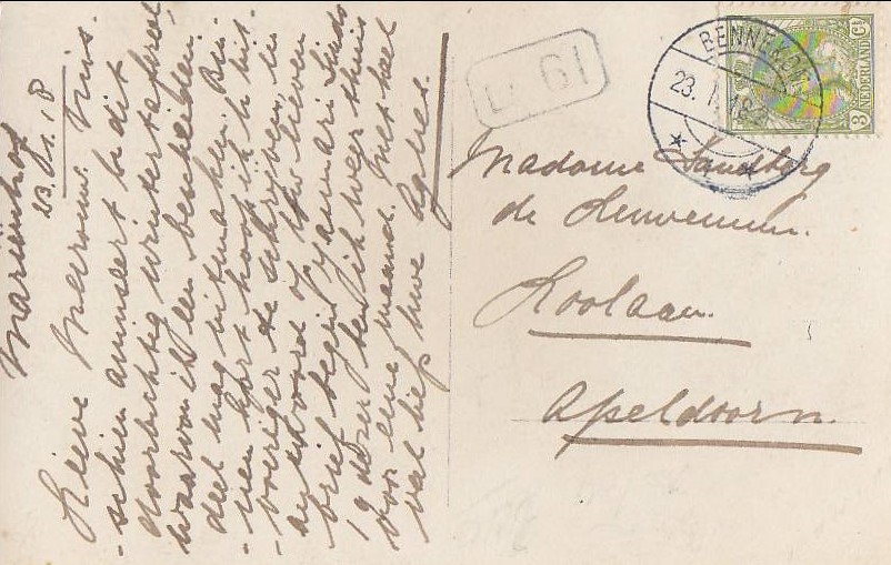 Achterop de fotokaart staat de ontvanger, mevrouw Sandberg aan de Loolaan in Apeldoorn, en hij is verstuurd door ene Agnes, vermoedelijk de hofdame die naast de koningin in de slede zit. “Misschien amuseert u dit doorluchtig wintertafereel waarvan ik een bescheiden deel mag uitmaken”, schrijft zij. In de eerste weken van januari 1918 heeft het flink gevroren en getuige deze foto ook flink gesneeuwd.