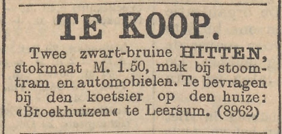 In Leersum kreeg Bert Hogendoorn een dos-à-dos van Stam in handen, afkomstig van de naburige buitenplaats Broekhuizen. Daar brandde in 1906 het oude kasteel van de familie Pauw van Wieldrecht tot op de grond toe af als gevolg van een petroleumlamp die iets te dicht bij de gordijnen stond. Een nieuw landhuis verrees. En uit het oude koetshuis, waarvan tegenwoordig alleen nog de buitenkant herinnert aan de oorspronkelijke functie, komt het rijtuigje van Hogendoorn. De kans is groot dat er een span zwartbruine hitten, van 1,50 meter schofthoogte, voor heeft gelopen. “Mak bij stoomtram en automobielen. Te bevragen bij den koetsier op den huize Broekhuizen”, aldus een advertentie uit het rampjaar 1906, waarin de auto al zijn intrede heeft gedaan bij jonkheer mr. Pauw van Wieldrecht, kamerheer van koningin-moeder Emma.
