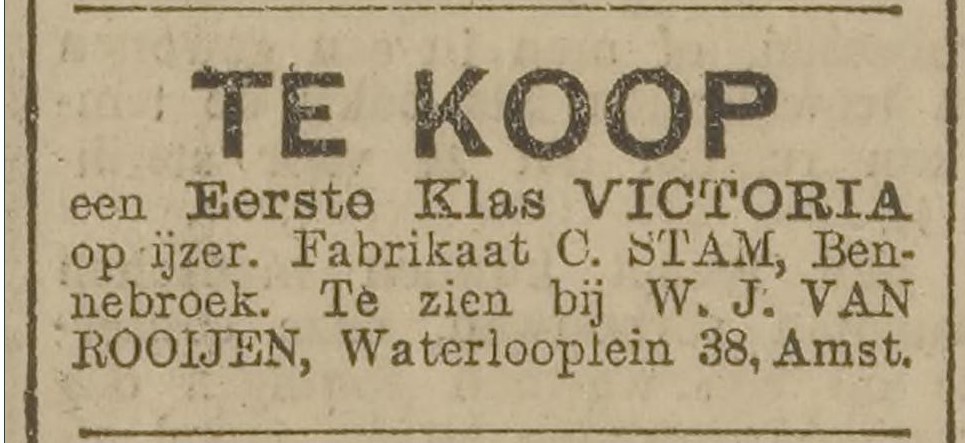 Frederik Stam (1805-1891) komt uit Nigtevecht-Loenen aan de Vegt, waar zijn vader Gerrit als mr.wagenmaker werkt aan ‘moderne’ landauers en bijvoorbeeld in 1826 te koop aanbiedt: “Een zeer solide calèche, heel ruim voor vier personen, en hebbende glazen op de zijden en uitspringende zwaanhalzen, alles naar den laatsten smaak.” Frederiks jongere broer Cornelis (1810-) volgt hun vader op, terwijl Frederik in Bennebroek een wagenmakerij kan overnemen van Johannes van Es, na diens overlijden in 1837.