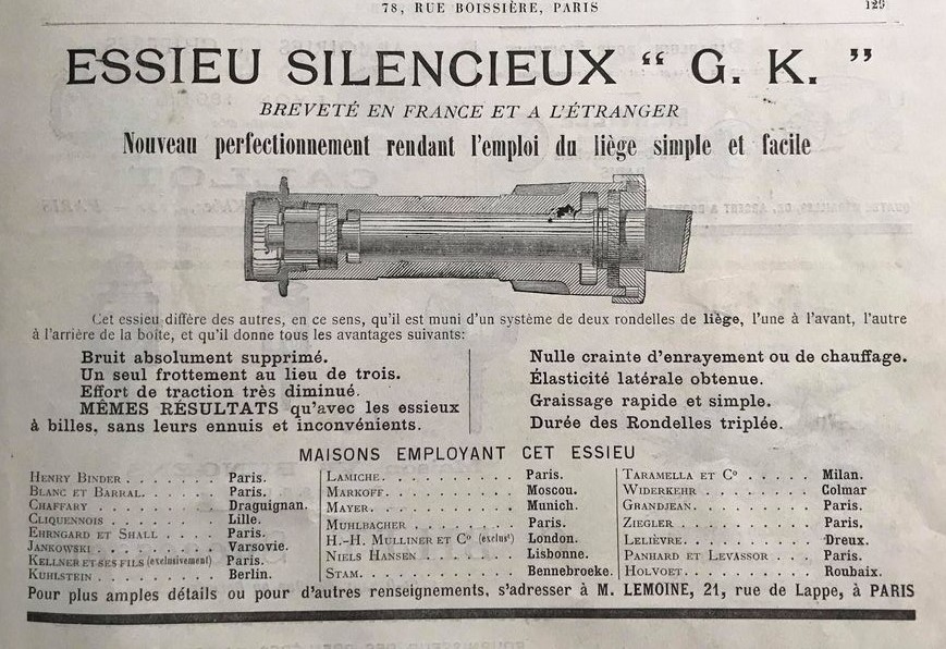 Een van de vaste adverteerders in Le Guide du Carrossier, het toonaangevende vakblad voor de rijtuigfabrikant, is de assenfabrikant M. Lemoine uit Parijs. In de hoogtijdagen rijden duizenden rijtuigen in heel Europa rond op assen van deze fabrikant. Lemoine noemt Stam in Bennebroek in een advertentie (15-8-1898) als afnemer van de gepatenteerde ‘stille as’, een as met twee kurkschijven die driemaal langer meegaan en het ei van Columbus lijken te zijn. Maar het is vooral opvallend dat Stam hiermee als enige Nederlander in een roemrucht rijtje staat met onder andere Mühlbacher, Kellner en Binder uit Parijs, de Duitse topbouwers Widerkehr, Kuhlstein en Mayer, Markoff uit Moskou en Mulliner van Londen.