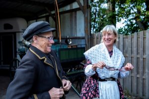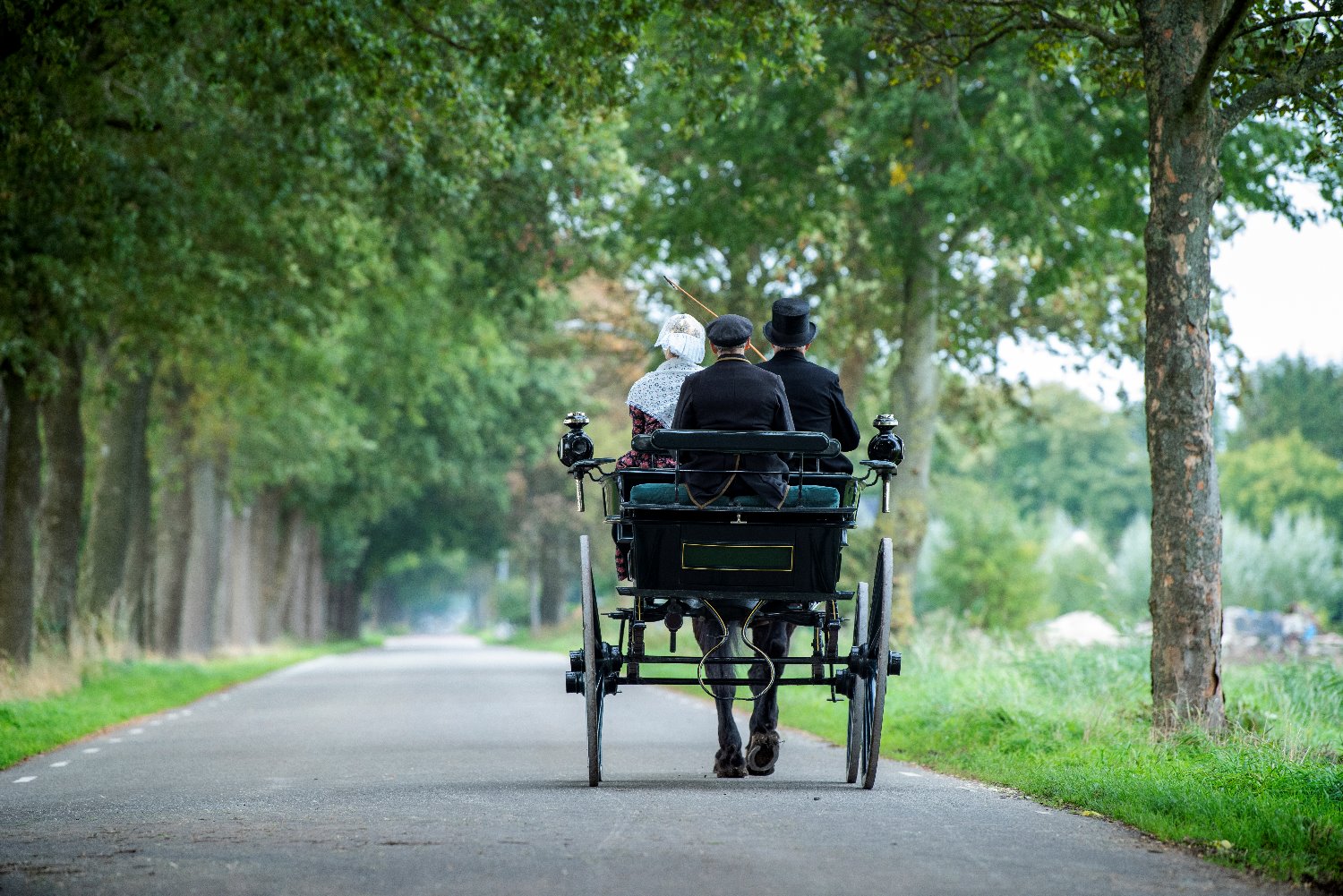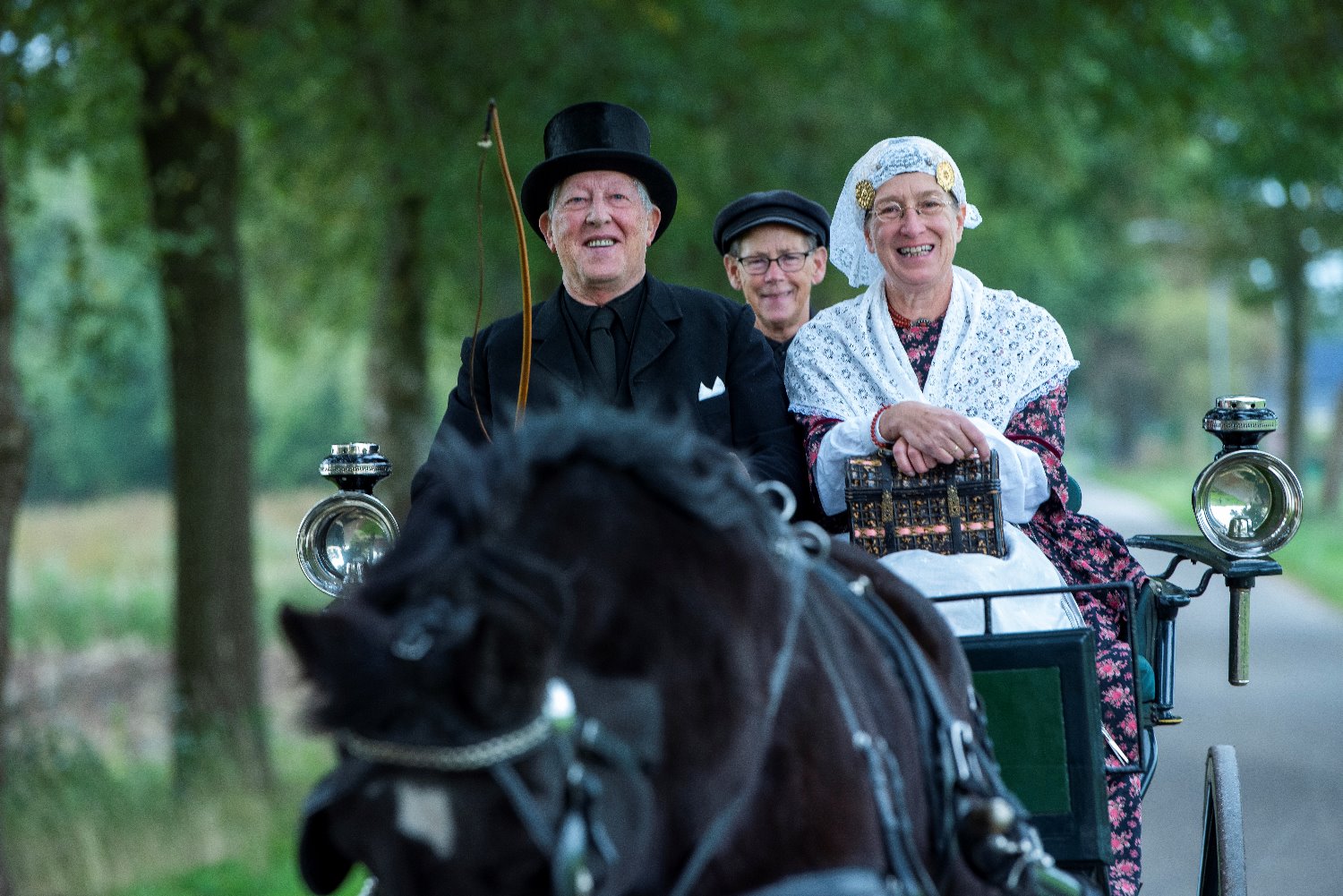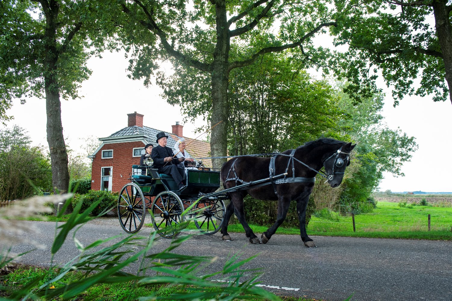 Spijt dat hij de boerderij van zijn grootouders niet overnam heeft Roel de Vries (73) niet. In plaats daarvan werkte hij zijn leven in loondienst, eerst als gemeentetimmerman, later bij de brandweer, en hij woont in een klein keuterboerderijtje aan de weg van Siddeburen naar Noordbroek. “Als ik op het rijtuig zit voel ik me toch nog als de herenboer die mijn grootvader was.” Want hij houdt één deel van de erfenis levend: het gerij en de kleding waarmee zijn grootouders ’s zondags naar de kerk gingen. Als Roel ‘uit rijden gaat’ loopt er een klassiek Gronings paard voor de wagen.