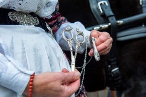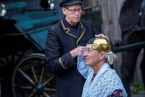 Als Roel het rijtuig aanspant om ‘uit rijden te gaan’, wat zo lekker deftig klinkt, doet hij dat niet alleen. Zijn vrouw blijft liever thuis, maar een goede vriendin, Janneke Smalbil, gaat in haar plaats mee om de rol van ‘echtgenote’ te spelen. Zij kleedt zich voor die gelegenheid in het oude Groningse kostuum, inclusief ‘gouden’ oorijzers en chatelaine. Dat laatste is een sierketting met daaraan een rijkelijk versierde schaar en een bewerkte naaldenkoker. Alles zwaar verzilverd. “Er hoort ook nog een speldenkussen aan, maar dat is weg en ze zijn erg zeldzaam, dus een nieuwe is er niet gekomen”, legt Janneke uit. De grootste kunst is het aanbrengen van de hoofdtooi, de haren in een band en bedekt met de grote ‘gouden’ oorijzers. Twee spelden met een rijk versierde knop houden de boel op hun plaats. “Normaal doe ik die spelden niet snel in, want je raakt ze zo kwijt.”