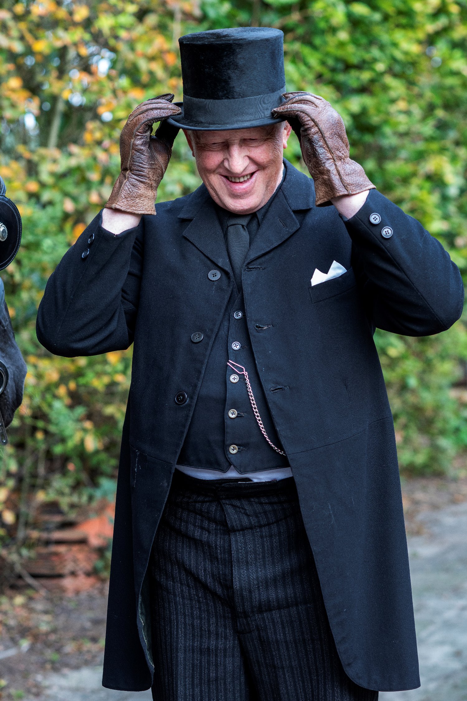 De hoed is hem wat te groot, zijn jas en vest knellen iets.