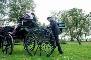 “Schrijf dit maar niet op, maar mijn grootvader had het niet zo op katholieken.” Zo verklaart Roel de Vries het feit dat het paard dat van stal komt Marina als roepnaam heeft, terwijl ze officieel Maria heet. “Marina bekt in het Gronings ook beter dan Maria”, excuseert hij zich verder. Hij is niet meer van de verzuiling, wel van de tradities. En zo komt het dat hij het rijtuig van zijn grootouders van moederskant, het echtpaar Corzaan-Hoving, koestert en voor de gelegenheid aanspant. “De familie Corzaan was enorm naamziek. Omdat ik was vernoemd naar mijn grootvader, was ik het lievelingetje en kreeg ik alles voor elkaar, terwijl ze mijn oudste broer niet zagen staan. Vandaar dat ze alle hoop erop hadden gevestigd dat ik de boerderij over zou nemen. Maar ik had niets met boeren. Ze waren echt boos op mij dat ik liever iets anders met mijn handen wilde doen.”