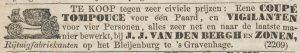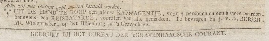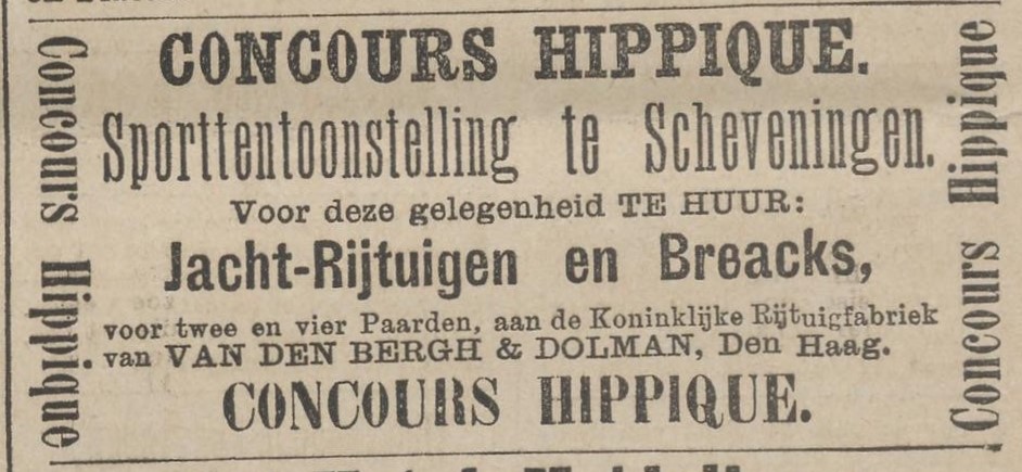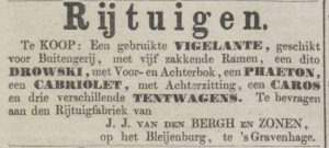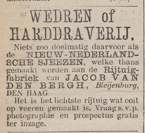 Jacob voert aanvankelijk nog het koninklijk wapen. Ronduit hilarisch is het berichtje in de Arnhemsche Courant van 14 augustus 1879: “Hoe gevaarlijk het is zich van eene taal te bedienen, die men niet volkomen magtig is, bleek ons uit een adreskaartje van een rijtuigmaker in den Haag. De heer Jacob van den Bergh geeft daarop de voorstelling van een rijtuig met het bovenschrift: La coureuse la plus legere ‘qui n’a jamais été faite’. Als het wagentje toch nooit gemaakt is, begrijpen wij niet waarom er eene voorstelling van wordt gegeven. Als rijtuig der toekomst had men het nog fantastischer kunnen maken.” In het Nederlands kan Jacob beter uitleggen wat hij bedoelt, want hij adverteert in het Nieuws van en Dag met ‘Nieuw-Nederlandsche sjeezen’ voor wedren of harddraverij, “Het lichtste rijtuig is dat ooit op veeren is gemaakt”.