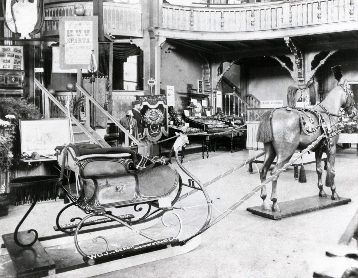 Tentoonstelling in de Dierentuin. Op de voorgrond een arrenslee