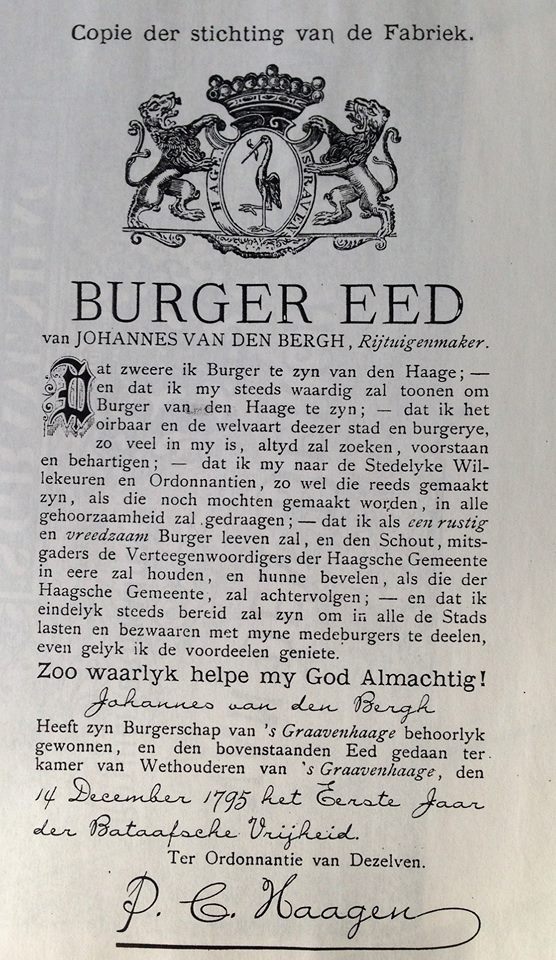 Het verhaal achter deze rijtuigfabriek gaat terug tot 1795, wanneer Johannes van den Bergh (1747-1825), afkomstig uit Culemborg en toen nog Kuilenburg genoemd, aan de slag gaat aan het Haagse Blijenburg. Hij heeft de meesterproef afgelegd voor het gilde van wielenmakers, niet als wagenmaker. Een wiel is misschien wel het wezenlijkste onderdeel van een wagen en het is daarom niet zo opmerkelijk dat een vakman als Johannes nog vóór 1800 een aanstelling krijgt als keurmeester van diligences en de rijtuigen de stalhouders in de stad. Voor diligences vindt maandelijks en de huurrijtuigen twee maal per jaar een keuring plaats. Johannes is ook aangesteld als beheerder van de middelen tot het vervoer van militaire goederen van de stad. Hoewel zo in de eerste decennia van de 19e eeuw er politiek en economisch nogal onrustig is, ziet het rond de eeuwwisseling roerige tijden zijn, ziet Johannes toch kans om de drie zonen, die hij krijgt met zijn vrouw Hendrika Behagel, aan het werk te zetten in wat is uitgegroeid tot een wagenmakerij. Dat zijn Christiaan, de zadelmaker, Frank als smid en Johannes Jacobus (1792-1875), wagenmaker. In 1822 timmeren ze aan de weg met complete rijtuigen, zoals nieuwe kapwagentjes, een reisbatarde en een Engelse koets op ijzeren assen en koperen bussen.