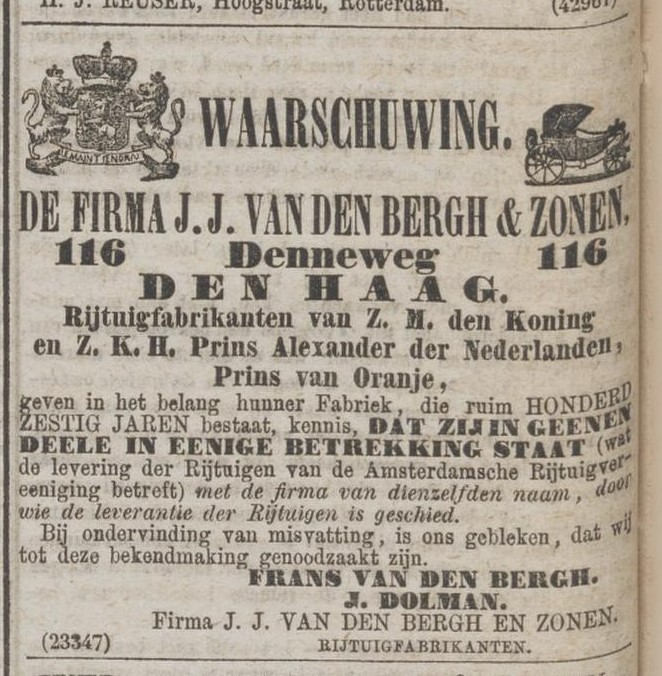 Bij een leverantie in 1881 aan de Amsterdamsche Rijtuigvereeniging door Jacob komt er blijkbaar een smet op de naam ‘Van den Bergh’, waarin broer Frans en zijn maatje Dolman een aanleiding zien om in meerdere kranten te waarschuwen dat zij niets met Jacob van doen hebben. Zij blazen dan gelijk van de toren, dat ‘hunner fabriek al honderd en zestig jaar bestaat’, wat volslagen nonsens is.