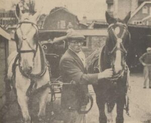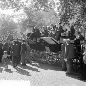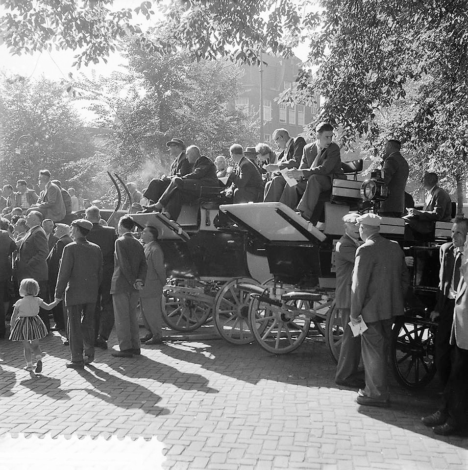 In 1957 heft in Rotterdam de NV Onderlinge Rouwvereniging op, een grote stal met 26 paarden en 27 rijtuigen, waaronder landauers van Bouman, Groningen en Vanden Plas Antwerpen. Eveneens in dat jaar volgt een veiling van de ‘NV Auto- en Rijtuigbedrijf v.h. Blok-Beijersbergen en v.d. Kuijlen’ of beter gezegd ‘Van Leeuwen’ aan de Gouvernestraat 20b in Rotterdam. Zelfs voor die naam mag eigenlijk wel ‘voorheen’ staan, want nadat Van Leeuwen in ’43 overleed, is de stal in handen van de man die met zijn weduwe trouwde, Jan Pley. Hij heeft nog vier ‘overjarige’, dus oude, zwarte paarden over. Naast de gebruikelijke rijtuigen zijn er een bijzondere break van de Duitse keizer en een mailcoach. Een Rotterdamse hoofdonderwijzer roept zijn stadsgenoten nog op in de krant om bij wijze van adhesie met Van Leeuwen in de pen te klimmen (“Telefoneren heeft geen zin, evenmin als het sturen van geld. Schrijf!”). Overigens was Van Leeuwen er in 1913 ook al mee gestopt…. En nu is de verkoping opnieuw een wassen neus: Jan Pley zet de stalhouderij, als laatste van Rotterdam, na de veiling onverdroten voort, met dezelfde spullen en minder concurrentie.