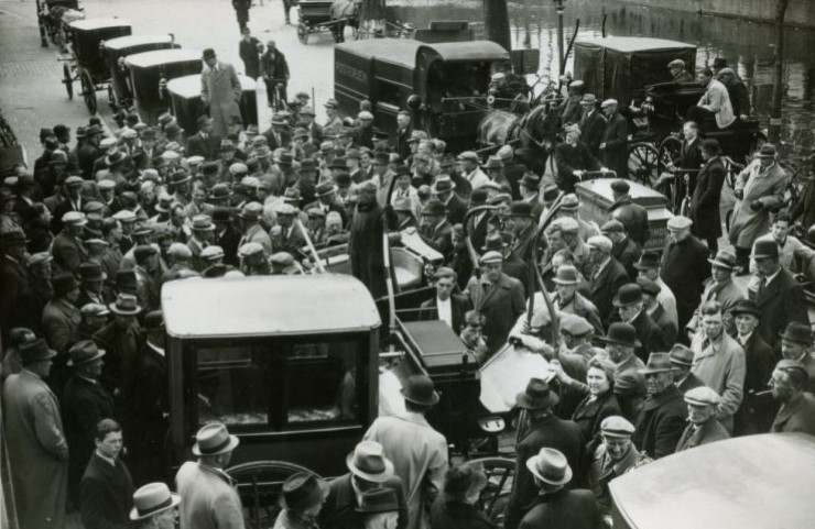 Ook in dat jaar de gedeeltelijke opheffing van stalhouderij Van de Brink aan de Heerenstraat 40 in Hilversum. Daar behoort naast de gebruikelijke coupés, landauers en victoria’s ook een kinderlijkkoets tot de te verkopen kavels. Van de Brink richtte in 1896 de Protestantse Begravenisvereeniging op, volgens een advertentie niet te verwarren met de protestantse afdeling van de Hilversumsche Begrafenisvereeniging. Concurrenten dus. Maar het mocht aan het einde niet meer baten, want in 1936 ruimt de ‘Hilversumsche’ op door te verkopen: 2 eersteklaswagens, een kinderlijkkoets, 5 statievolgers, 5 zwarte vigilantes, een Kimman landauer, kleden, tuigen, pluimen en de verdere santenkraam. In Hilversum zijn geen paarden meer nodig voor een teraardebestelling. In 1937 is de rest van Van de Brink te koop, ditmaal aan de Ruitersweg 10 in Hilversum, waar nog één eersteklaslijkkoets, volgrijtuigen, coupés, landauers, victoria’s, brikken en andere handel resteren voor de verkoop.
