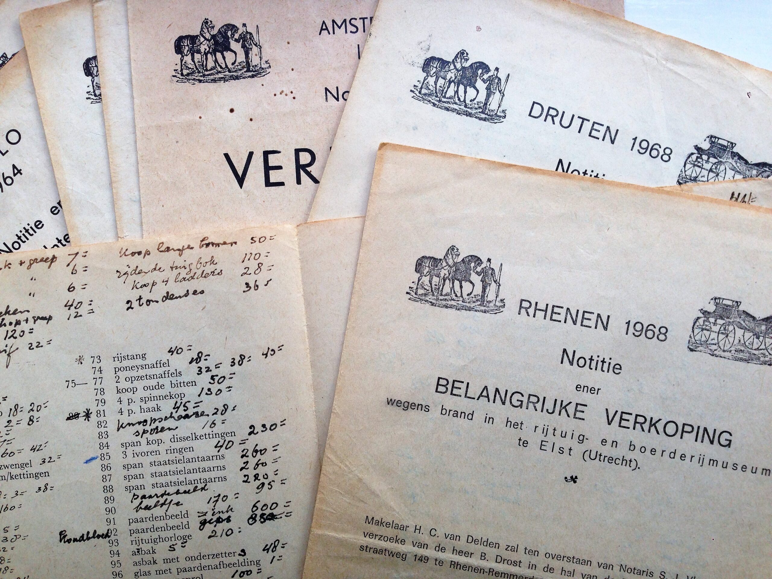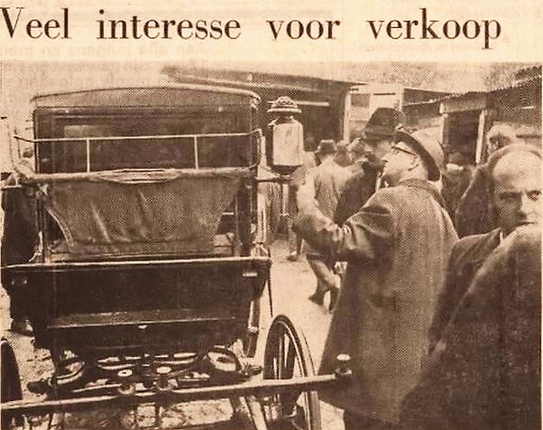 In juni: uitverkoop wegens brand in het Rijtuig- en Boerderijmuseum in Elst. De heer Drost heeft het verzameld en zit omhoog met zeven spantuigen (gem. 200,-), twee coupés van Hermans (700,- en 1.000,-) een victoria van Veth (1.325,-), dos-à-dos van Kimman (1.725,-), vier tilbury’s (80,- tot 220,-) en dergelijke.