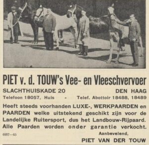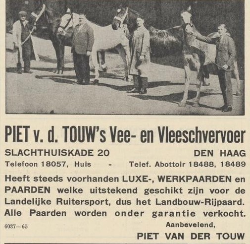 In 1930 opende vleesvervoerder en paardenhandelaar Piet van der Touw vol trots een nieuw onderkomen aan de Slachthuiskade 20 in Den Haag, met dertig gevulde paardenstallen en negen vrachtauto’s. De bloemstukken waren niet aan te slepen voor het feestje. Maar in 1948 moet Van der Touw noodzakelijkerwijs inbinden. De luxe concourspaarden gaan weg: tien stuks, waaronder het kampioenspan Janco en Hina, de showwagens en spiders. Het is niet de eerste en niet de laatste verkoping die de Van der Touws doen; in 1960 rijdt zoon Joop de monsterrit met een postkoets van Istanboel naar Rotterdam om de Floriade te promoten, alvorens rijtuig en paarden in één klap aan de Amerikaan Jack Pemberton te verkopen en de deur van het koetshuis definitief achter zich dicht te trekken.