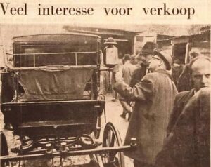Een maand later in Bussum vindt opnieuw het gebruikelijk ritueel plaats, namelijk van twee stalhouderijen met de geijkte inventaris. Het is wel voor het eerst dat de kranten de nieuwswaarde gaan zien van zo’n veiling: “Bussum heeft het slechte voorbeeld van Hilversum gevolgd. Ook hier heeft de techniek de romantiek verdreven, en zullen geen stralende bruidjes meer in romantische trouwcoupés naar het stadhuis rijden. De statige lijkkoetsen zijn van de weg verdwenen en na een korte opleving in de oorlogsjaren van paard en rijtuig, heeft de auto hier weer de plaats hervonden, welke hij reeds voor de oorlog aan het innemen was. Na een kwijnend bestaan in de laatste jaren hebben de twee laatste en oudste stalhouderijen ter plaatse, de fa. v. d. Linde in de Landstraat en Buwalda aan de Brinklaan hun strijd opgegeven en hun inventaris in veiling gebracht. De paarden waren reeds uit de hand verkocht. Er bestond voor deze exclusieve veiling buitengewoon grote belangstelling, niet alleen uit het Gooi, w.o. vele boeren, doch uit het gehele land was men naar Bussum gekomen, uit Den Haag, Rotterdam, Amsterdam. Abcoude, Driebergen en zelfs uit Brabant. Vele koopjes gingen Bussum uit De makelaar M. van Delden bracht de inventaris ten overstaan van deurwaarder Hermes in veiling en het gezelschap was hoog gezeten op een boerenwagen, terwijl de kopers, die vrij rumoerig waren, in de stalhouderij de koopjes bespraken. De gehele stalhouderij was gevuld met vele werktuigen en gereedschappen, terwijl buiten de trouwcoupés, landauers, lijkkoets, kinderlijkkoets, zwarte staatsiekoetsen en de vigilantes stonden. De wanden waren ingenomen door fraaie spannen- en eenpaardstuigen, livreien, w.o. zwarte bokjassen en zomerjassen, zwarte pluimen en sjabrakken, arrentuigen en arrenbellen. De in den treure voor de radio gespeelde en gezongen schlager: ‘Er hing een paardenhoofdstel aan de muur’, was hier in praktijk gebracht, en er hingen er zelfs vele, w.o. vele goede. Aanvankelijk was men wat schuchter met het bieden. Het eerste koopje – een hooivork en een greep – ging voor twee kwartjes naar Rotterdam. Voor de twee metalen paardenkoppen, uithangborden voor een stalhouderij, bleek nog veel belangstelling. Men joeg ze op tot 36 gulden. Een prima staatsielantaarn liep op tot ƒ 70, doch prachtig arrentuig met leidsels en koppluimen, als iets aparts aangekondigd bracht het slechts tot ƒ 24. Het paardenhoofdstel uit de schlager heeft de auteur meer opgeleverd dan de stalhouder. Het kwam slechts tot ƒ 14. Een zwarte bokjas zal voor ƒ 62 in Abcoude worden afgedragen. De koper had de keus voor de volgende, doch was zo verstandig er maar één te nemen, want de andere gingen voor ƒ 17, waarna de rest snel devalueerde tot ƒ 5, ƒ 2 en zelfs ƒ 1.” (Gooi- en Eemlander 24-10-1949)
