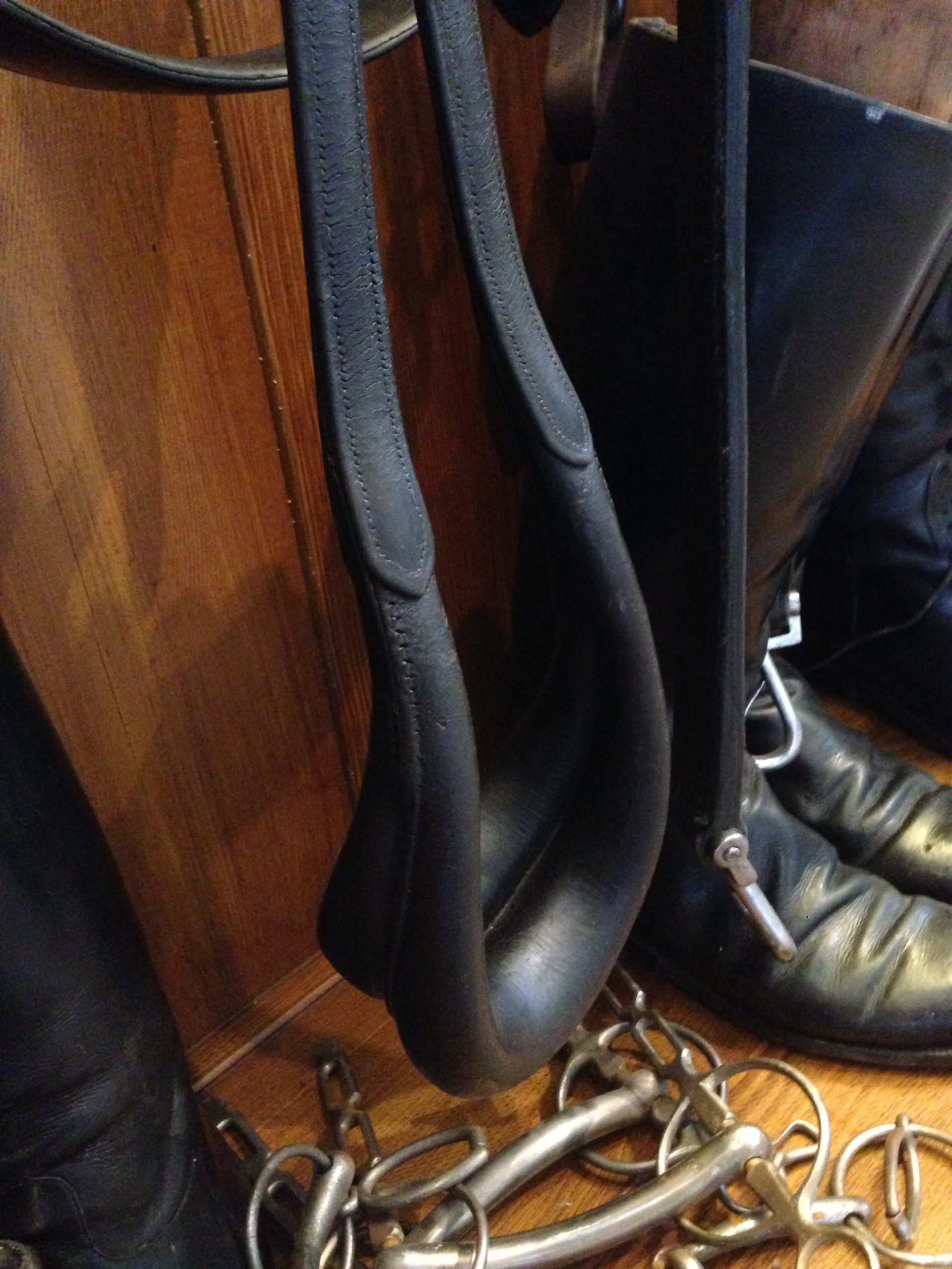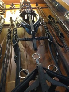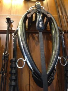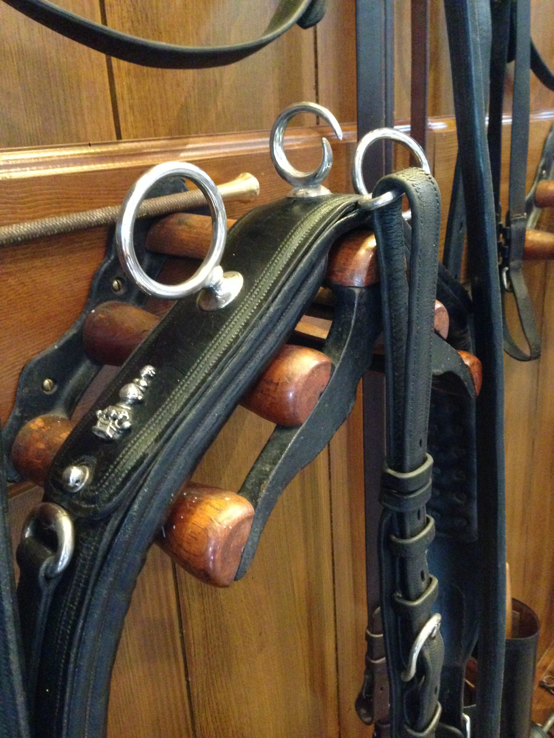 Boven elkaar in de kast: hoofdstel, gareel en schoftje van het achtertuig. Gareel.