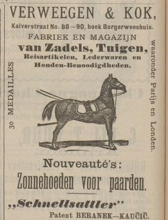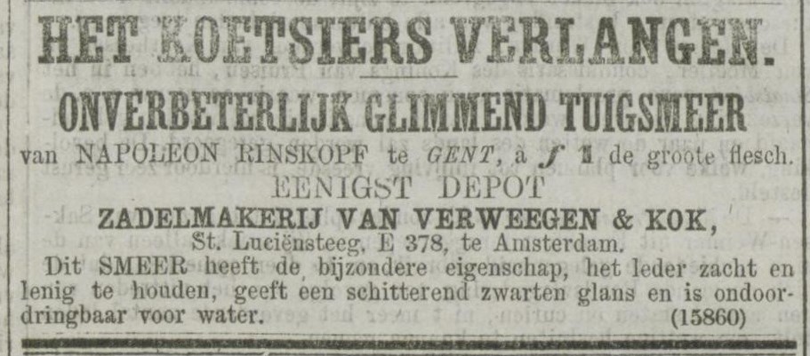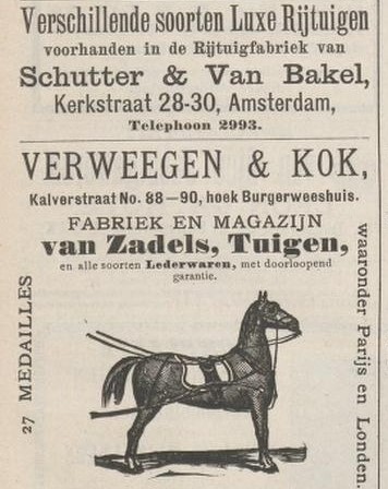 In een sinterklaasverhaal van het Handelsblad (22-11-1889) komt een veelzeggend citaat voor: “Wel natuurlijk; ’t loopt voor een rijtuig van Gebrs. Spijker, met een tuigje van Verweegen en Kok; ’t goede hoort bij elkaar.” Die sinterklaasverhalen in het Handelsblad over waar de goedheiligman zijn inkopen doet, uiteraard ter promotie van de Amsterdamse middenstand, laten zien dat er een trend is ingezet naar andere lederwaar: “de voortreffelijke lederwerken van de zadelmakers Verweegen & Kok, die voor de velerlei behoeften van een negentiende-eeuwsch gezellig mensch een even geopend oog toonen te hebben als voor die van paard en rijtuig.”