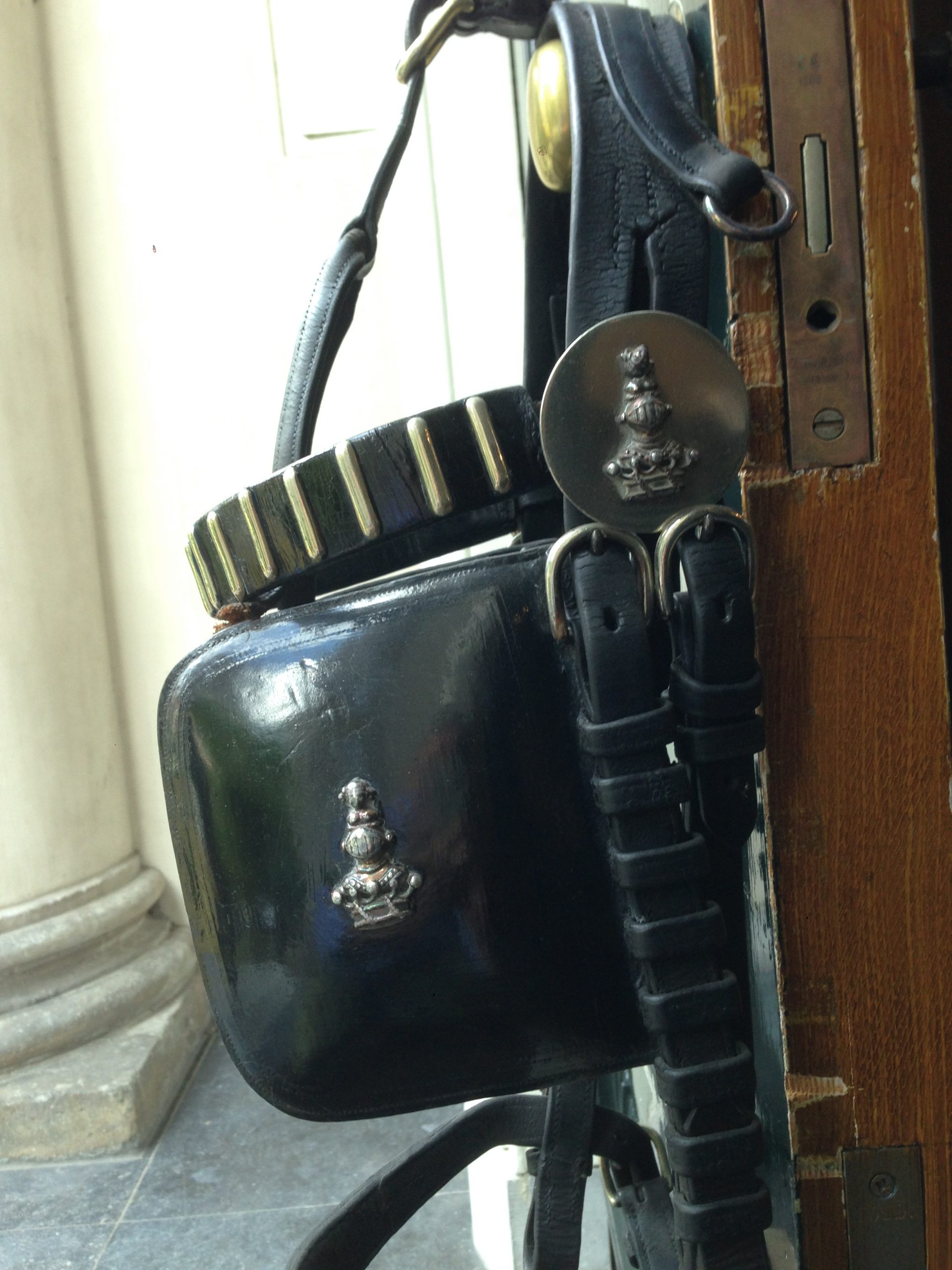 Hoofdstel met het helmteken van de jonkheren Van Loon op oogkleppen en rozetten.