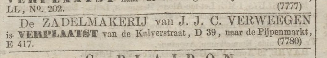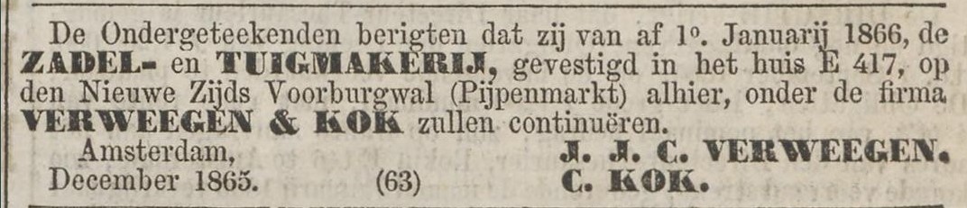 Jan Jacob Christiaan Verweegen (1799-1870) uit ’s-Gravenhage, evangelisch-luthers van geloof, schrijft zich in 1819 in aan de Amsterdamse Kalverstraat, ter hoogte van de Munt. Daar begint hij een zadelmakerij. Jan trouwt met Charlotte Oostenberg (1799-1865) en ze krijgen vijf kinderen. In 1857 verhuizen ze naar de Nieuwezijds Voorburgwal, naar de Pijpenmarkt om precies te zijn, waar Jan een betaalde baan kan krijgen als buurtsecretaris, ambtenaar dus, en dat levert meer op dan de zadelmakerij. Het gaat hem goed genoeg om een dienstbode in huis te nemen. Van zijn drie zoons volgt een (Eduard Henri) hem op als ambtenaar en een ander (August George) treedt in zijn voetsporen als zadelmaker, maar geen van hen is in staat om als gelijkwaardig partner in de zaak te komen. Wie dat wel kan is Carel Kok (1840-1900), die onder de hoede is gekomen van Verweegen. Carel is een beetje een verhaal apart. Kok is de achternaam van zijn moeder, die hem en zijn broer zonder de aanwezigheid van een -onbekende- vader weet op te voeden. Ze wonen in bij haar broer Pieter, barbier aan de Weteringstraat.