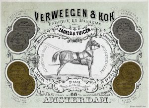 Op de tentoonstelling van rijtuigen, tuigen en dergelijk die de harddraverijvereniging van Groningen in 1889 organiseert, is ditmaal de eer aan Carel Kok om de ingezonden tuigen en zadels te jureren. De firma heeft aanzien, ook onder vakbroeders. Van zadelmakers is er het werk te beoordelen van Van der Nap (Groningen), Van Liemt (Amsterdam), Graalman (Winschoten), Van Es (Wijhe), Pot (Ezinge) en Fongers (Groningen). Maar de Amsterdamse jury ziet geen reden om een gouden medaille uit te reiken, het meeste is brons waard. Zijn eigen spullen daarentegen… “Bij het binnentreden van het ruime tentoonstellingsgebouw rechts staat men verwonderd over de uitgebreide verzameling zadels, tuigen enz. van de heeren Verweegen & Kok (Kalverstraat 88/90) Amsterdam. Waar is het begin en waar het einde van zoveel bezienswaards, van zoveel degelijks, van zoo groote, werkelijk rijke tuigage? Het span luxetuigen met borststukken, zoowel als dat met garelen, zou de gouden medaille zonder twijfel verkregen hebben indien de heer Kok niet buiten mededinging (zijnde jurylid) geëxposeerd had. Het volledig arrentuig is even fraai als degelijk bewerkt, de halsters voor luxe-gebruik, het volledig tuig voor een rijpaard, de rijke verzameling stangen voor weelde-gebruik, de paardedekken met manekappen voor luxe-gebruik, de plaids, tot zelfs de zweepen, karwatsen zoowel als de rijtuiglantaarns en nog veel andere nuttige zaken, getuigen van het hoogste wat er op dit gebied geleverd kan worden. Waar Parijs in 1878 en ’84, Amsterdam in ’74, ’77, ‘78, ’83 en ’86, ‘s-Gravenhage in ’74, Londen in ’84 enz. enz. de inzendingen van deze firma met goud bekroonden, zou het geen wonder zijn dat Groningen ook haar de hoogste onderscheiding had waardig gekeurd. Van vele zijden hoorden wij met lof gewagen van deze inzending, als een van de schoonste afdeelingen dezer belangwekkende tentoonstelling. De indruk door de heeren Verweegen & Kok alhier gemaakt, is alleszins gunstig te noemen”, aldus de lofzang van het Algemeen Handelsblad op 31 juli.