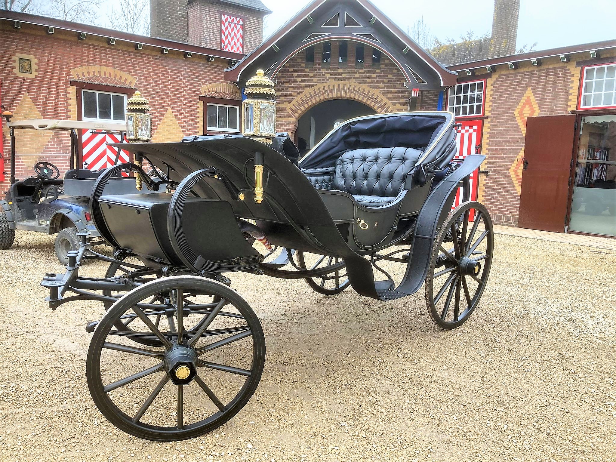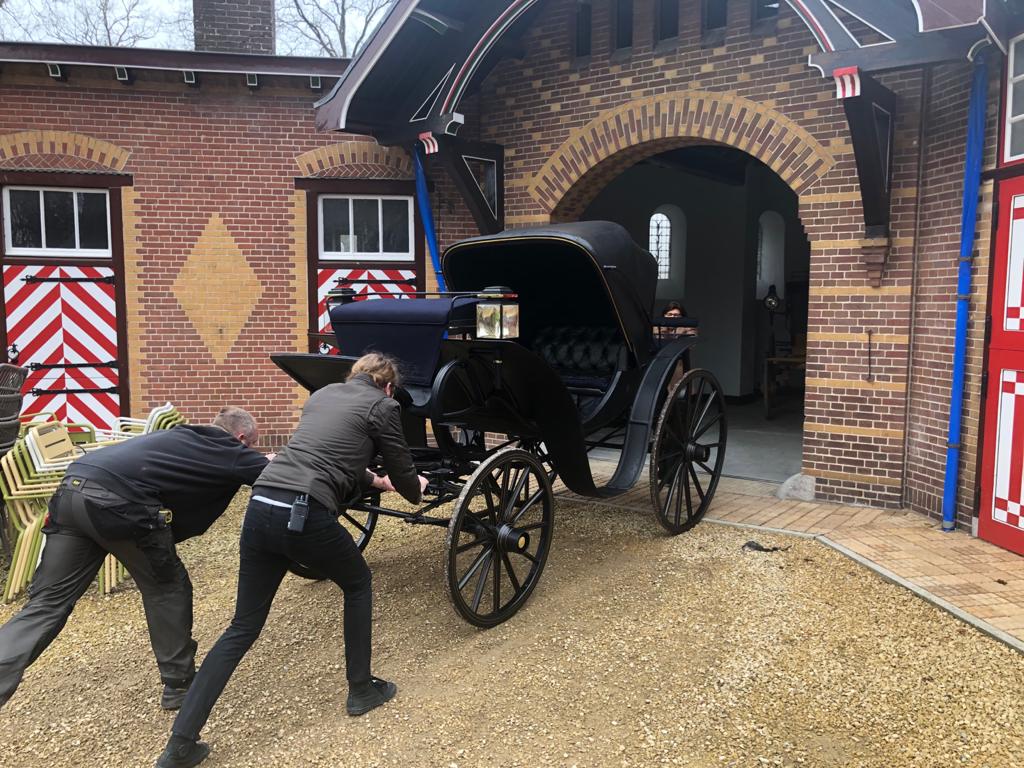 Dinsdag 10-3-2021. Vandaag zijn de vier rijtuigen die in de afgelopen twee jaar zijn gerestaureerd teruggekeerd op Kasteel De Haar in het Utrechtse Haarzuilen. De break stond er al opgesteld in het entreegebouw en daar zijn daar de calèche, victoria en napoleon bijgekomen. Het kasteel gaat nu aan het werk voor de beste manier om ze te exposeren: zodra de poort open mag voor publiek zijn ze te bewonderen in het stallencomplex.
