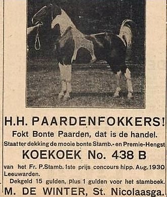 Het lijkt op een kortstondige herwaardering van bont in het interbellum, wanneer De Winter uit St.Nicolaasga in 1931 zijn bonte Friese stamboekhengst Koekoek nr.438B ter dekking aanbiedt met als kreet ‘H.H. Paardenfokkers! Fokt bonte paarden, dat is de handel’. Het stamboek kent een zwarte Friese fokrichting en een bovenlandse fokrichting met meerdere kleuren. Die twee fokrichtingen zijn goeddeels gescheiden, maar lopen af en toe door elkaar heen als een fokker ‘ns iets anders bij zijn Friese merrie wil, zoals Koekoek en de eveneens bonte Hellas (441B). Twee bonte op twintig goedgekeurde hengsten in Friesland. De schrijver van Hepkema’s Courant (10-6-1931) heeft enigszins zorgen over het verdwijnen van de zwarte kleur in de Friese weiden: “Wat nu de haarkleur betreft, deze is in de Friesche fokrichting van overwegend belang, terwijl zij juist bij de bovenlanders van ondergeschikt belang is. Friesche merriën mogen dus, van fokkersstandpunt beschouwd, de bonte hengsten niet worden aangeboden. Dit blijft dus iets voor de bovenlandsche fokrichting, ook al zijn wij niet heelemaal gerust, dat deze hengsten geen Friesche merriën zullen dekken. Immers Koekoek en Hellas staan beide in het weidegebied van Friesland ter dekking, de streek bij uitnemendheid voor het zwarte Friesche paard. Evenwel, men houdt in onze provincie nog al van liefhebberen op paardengebied. Tal van Friesche boeren hebben wel eens zin in een bont veulen. Deze verkeeren dus thans in de gelukkige omstandigheid dat zij de keus hebben tusschen twee bonte vaderpaarden. Onlangs verzekerde ons een veehouder, dat van dien eenen hengst zoo weinig bonte afstammelingen kwamen. Velen worden dus nog teleurgesteld ook.” Wanneer Koekoek en Hellas ook een jaar later de goedkeuring krijgen, waarschuwt De Standaard (20-2-1932): “Friesland heeft zijn bonte koeien; dat het bewaard worde voor te veel bonte paarden!”