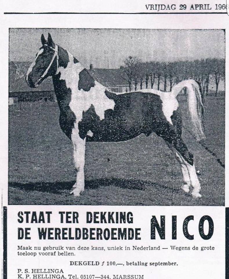 Een kleine stukje geschiedenis herhaalt zich met Nico: “Twee zeventienjarige jongens uit Leeuwarden, die in Marssum logeerden, vroegen de heer P. Hellinga om een foto van zijn vermaarde bonte hengst Nico te mogen maken. (…) In een onbewaakt ogenblik echter hebben de beide jongelui een flink stuk uit de staart van de hengst geknipt. Ze wilden het bonte paardenhaar, zo bleek later aan de vlaggenstok van hun tent vastbinden.” (Leeuw.Cour.8-7-1966).
