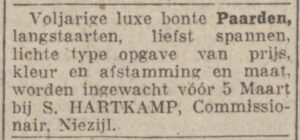 “Naar aanleiding van hetgeen door ons over de bonte paarden, die wij op de tentoonstelling te Texel aantroffen, hebben geschreven, merkt de heer C. Gerritsen op, dat de bonte hengst, de vader van deze bonte paarden, één jaar goedgekeurd is geweest. Verder, dat de bonte paarden zijn gegaan met prijs en premie. Het stel bontjes van twee en drie jaar won bij ’t concours hippique den 2den prijs en een driejarige bij de keuring van 11 september den 1sten prijs. De afstammelingen van den bonten hengst werden tot heden steeds verkocht voor buitengewoon hooge prijzen voor Texel. Wij deelen het bovenstaande gaarne mede, en vooral de laatste mededeeling verheugt ons; hoe hooger de prijzen zijn voor de bonten, des te aangenamer voor de fokkers. Een andere vraag is het, of het aanbeveling verdient met bonte hengsten te fokken. Over het algemeen zijn de bonte paarden niet gewild. Toch kan bet voorkomen dat voor bonte paarden grof geld wordt betaald. Zoo deelde de eigenaar van een bekenden stal ons mede, dat hij onlangs twee bonte paarden zeer duur had kunnen verkoopen, hij had een opdracht uit het buitenland, doch kon ze nergens vinden. Maar dat zijn uitzonderingen.” (Nws dv Dg 14-10-1908).