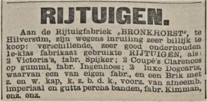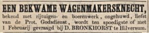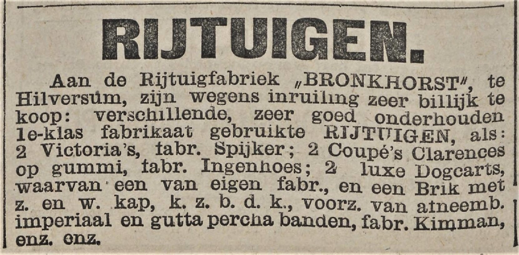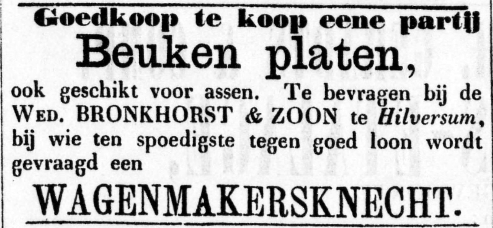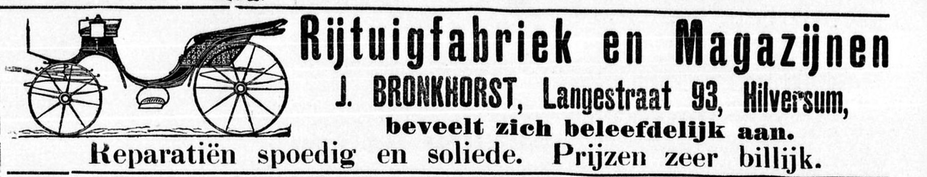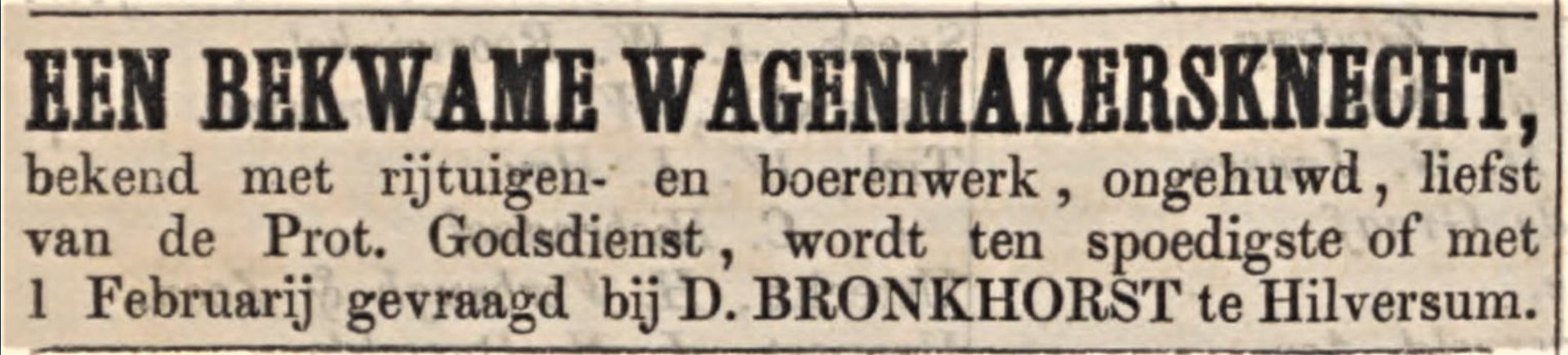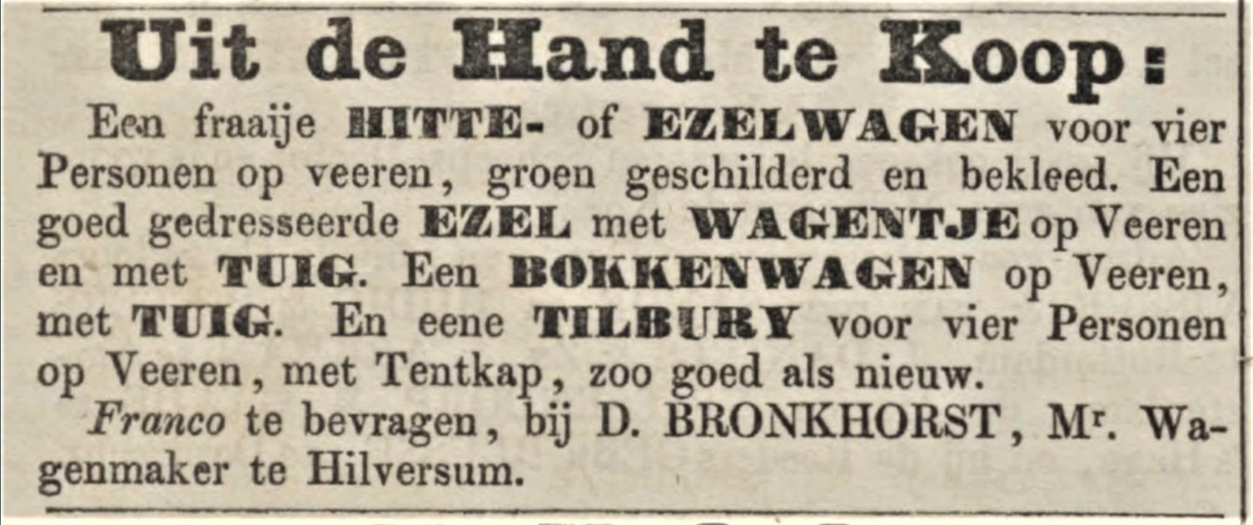 Dirk Bronkhorst (1813-1870) zet na het overlijden van zijn vader in 1836 de wagenmakerij in Hilversum voort. Hij maakt landbouwwerktuigen als een ‘eegde’, hittenwagens en een incidentele tilbury, en biedt een ezelwagen te koop aan, compleet met tuig en ezel. Hij zoekt jaarlijks een nieuwe wagenmakersknecht om hem een handje te helpen, steevast van protestantse huize, ongehuwd en ‘bekend met boerenwerk en liefst ook met rijtuigwerk’, wat aangeeft dat Bronkhorst nog niet zozeer bezig is met rijtuigen. Een vlug lopende ezel en een bok zonder hoorns, die hij met wagentjes en tuig probeert te verkopen, zijn de binnenkomers bij de meer welgestelde klanten die zoiets zoeken voor hun kinderen. Het levert hem geleidelijk aan luxer werk op.