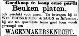 Leuk weetje: in 1911 schenkt Jacob Bronkhorst een ringslang aan dierentuin Artis. En in datzelfde jaar waait de stokoude kastanjeboom om die al mensenheugenis naast de wagenmakerij van zijn vader staat. De boom neemt een deel van een muur in zijn val mee. De schade valt mee, want de boom was al langer aan het aftakelen en minder massaal dan in zijn gloriejaren, waarin de Hilversumse jeugd eronder samenschoolde. “De boom van Bronkhorst heeft nog een saaien ouwe dag gehad. Voor jaren is hem ontnomen, die heerlijke rommel van half doorgezaagde stammen, stapels planken, hoopen wagenschot, wielbanden en wat weet ik. Toen was het plezier uit z’n leven, want de jongens en meisjes bleven weg; hij voelde dat hij alleen als boom niks beteekende voor hen. De ouwerwetsche wagenmakerij werd rijtuigfabriek en naast zich kreeg hij een effectenkantoor. In die ‘nette’ omgeving verveelde hij zich doodelijk, hij versufte. Vreemde menschen, onechte Hilversummers vonden hem mooi – als boom – maar wat gaf hij dáárom?” (De Gooi- en Eemlander 7-10-1911).