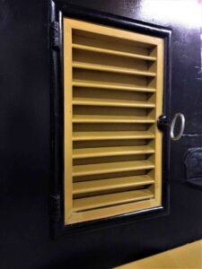Art deco-achtig snijwerk aan het onderstel. Deurtje met jaloezielatjes geeft toegang
