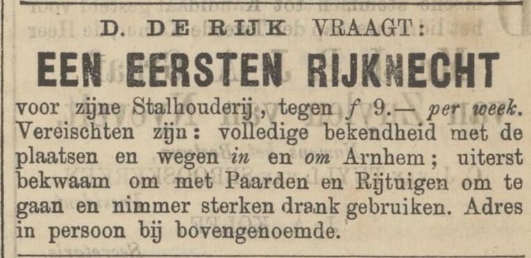 De kloof tussen arm en rijk is in deze streek enorm. Het is de tijdgeest. Ook in de stalhouderij, want in de winter neemt het werk aanmerkelijk af en zijn het de werknemers die hierdoor zonder inkomen komen te zitten: Dirk de Rijk zet ze eenvoudigweg als seizoenwerkers op straat. Toch is Dirk niet ongevoelig om een bejaarde koetsier te helpen om nog voor het invallen van de winter een andere baan te vinden: “Een bekwaam koetsier, P.G, van rijpen leeftijd, gehuwd, doch geene kinderen meer tot zijn last hebbende, biedt zich aan om met november e.k. of later in dienst te treden, zijnde niet ongenegen om ook als noodhulp te gaan. Hij verstaat volkomen het rijden met twee zoowel als met vier paarden; zijne vrouw bezit alle geschiktheid om eene melkerij waar te nemen, doch dit is geen vereischte bij de aanvraag van koetsiersdienst. Men is in staat, de beste informatiën te leveren van bekwaamheid en goed gedrag. Brieven franco, onder letters H.R., bij den Stalhouder D. de Rijk, Vossenstraat, te Arnhem.” (Opregte Haerlemsche Courant 3-10-1863).