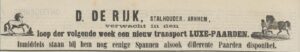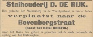 Daarbij is er de vestiging op het Stationsplein, gelijk naast de uitgang van het station. “Iets geheel nieuws op het gebied van reclame is ontvangen en toegepast door de stalhouderij van de firma D. de Rijk op het Stationsplein alhier. Het is een zeer mooi en vernuftig uitgedacht middel om de aandacht van het publiek te trekken en bestaat uit een beweegbaar reclamebord, vervaardigd door den rijtuigmaker den heer van der Pavert, met een electrische groote schel.” (Arnh.Cour. 22-5-1909)